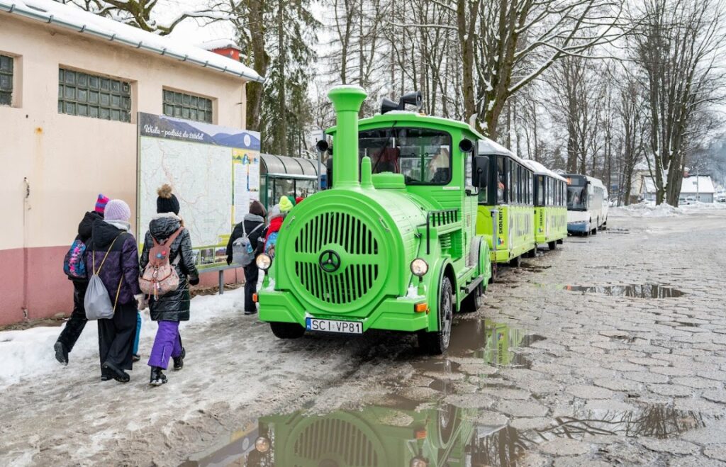 Uczestnicy wyprawy na stacji Wisła Uzdrowisko wysiedli z pociągu, by… przesiąść się do turystycznej ciuchci jadącej w kierunku… skoczni narciarskiej im. Adama Małysza.
