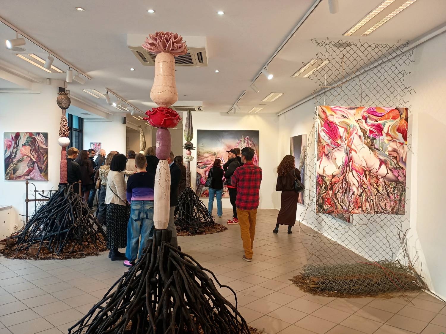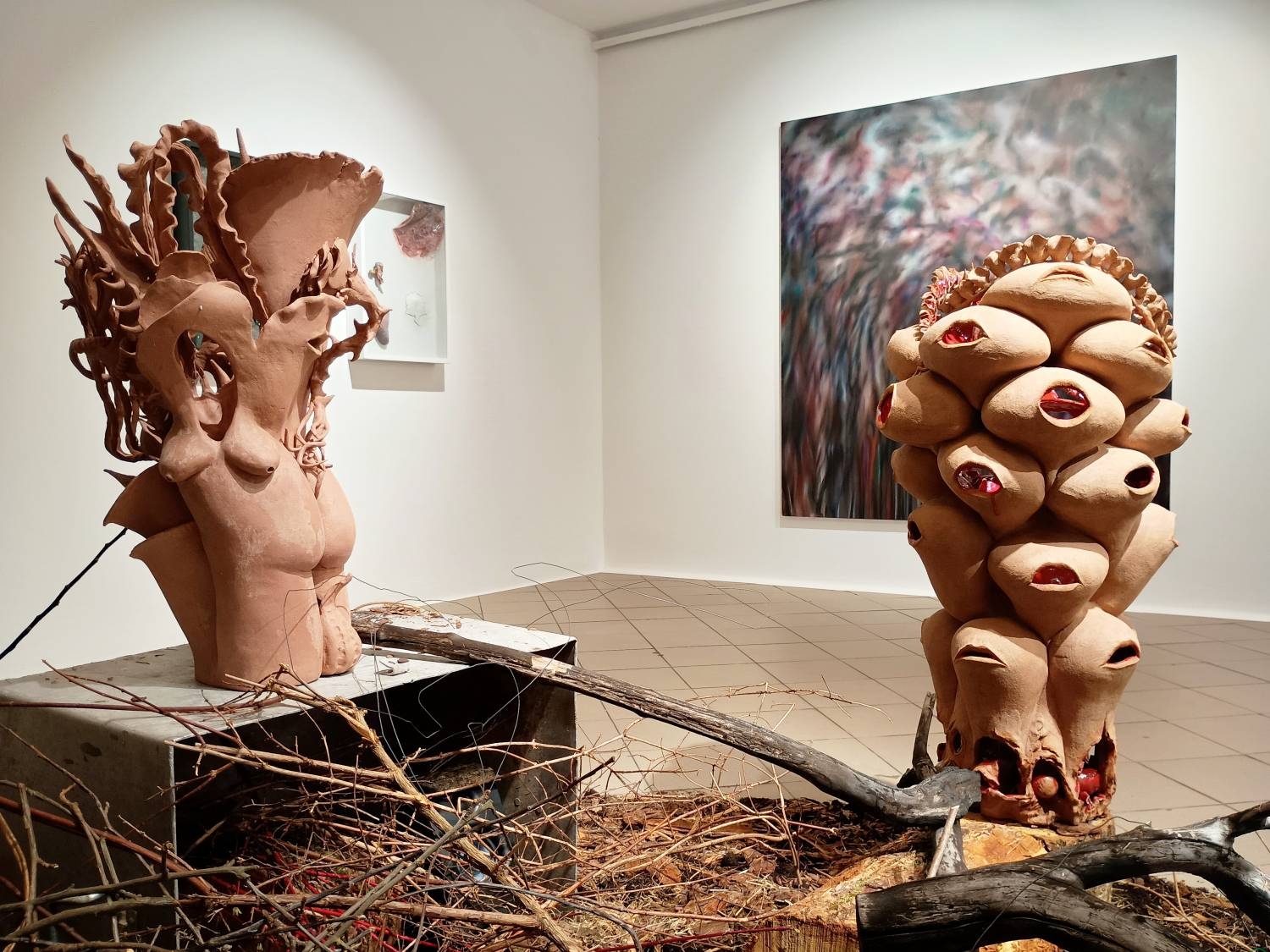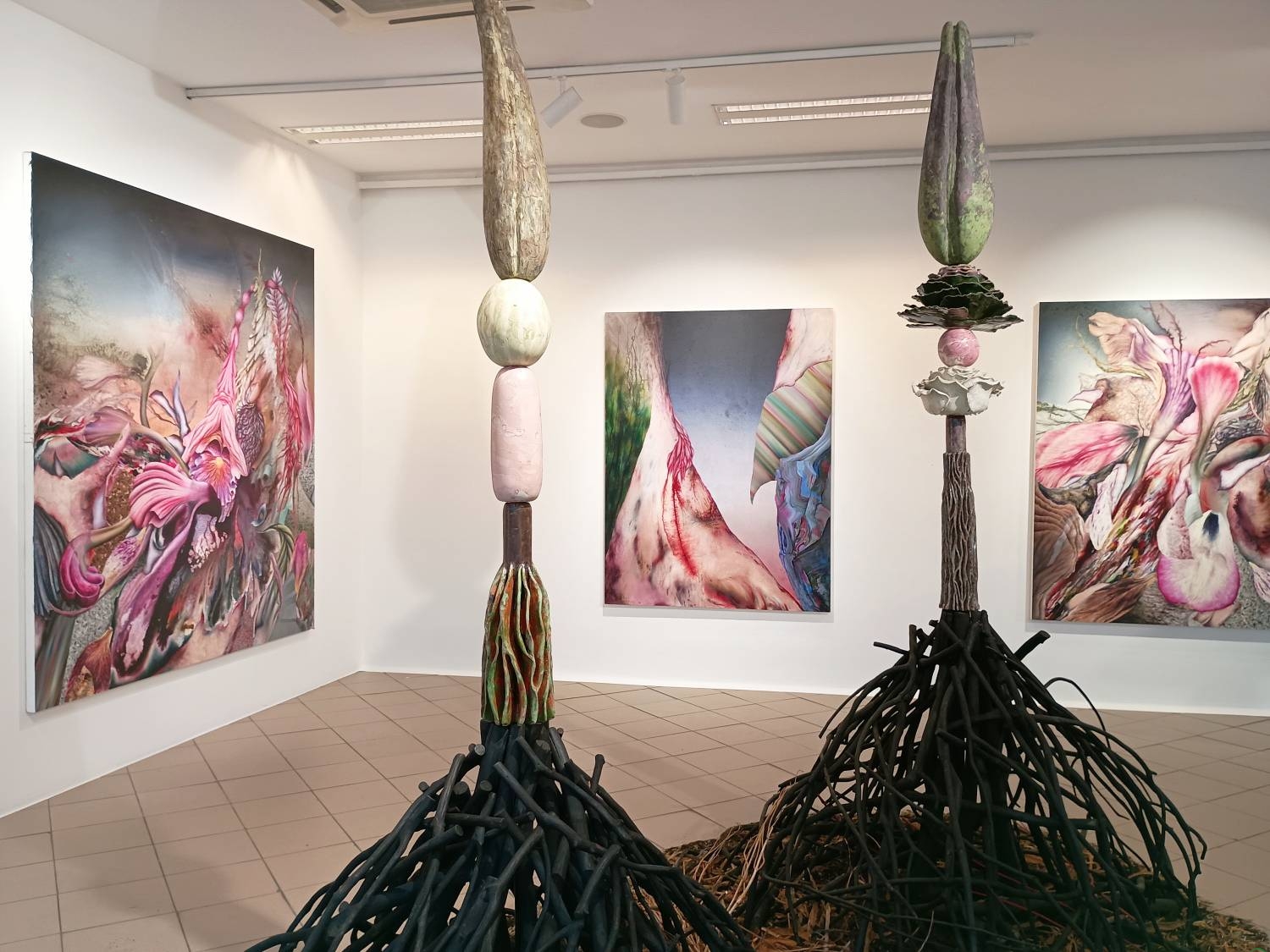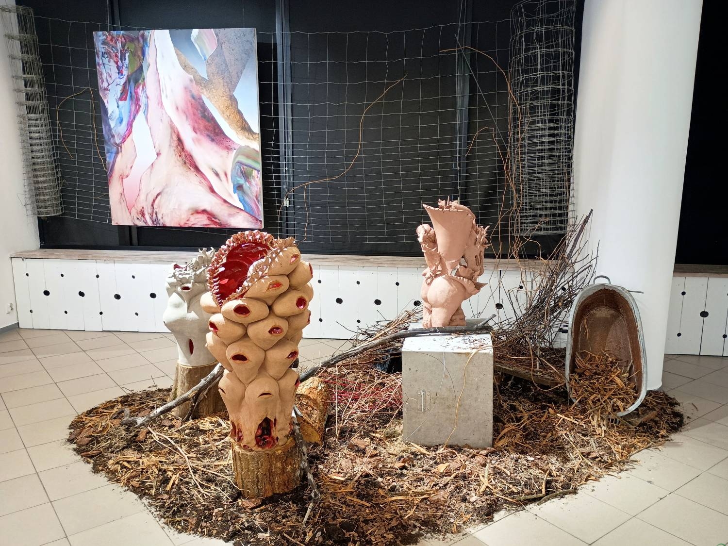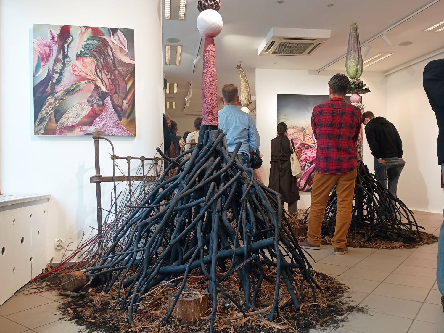 Uwagę zwracają pokaźnych rozmiarów obiekty z cyklu „Organizmy na chwilę”, przypominające drzewa „wrośnięte” w podłogę galerii. – Ich podstawa wykonana jest z drewna pozyskanego z wycinki Puszczy Knyszyńskiej – wyjaśnia artysta. – Z punktu widzenia gospodarczego jest to drewno bezużyteczne, bo zbyt cienkie. Efekt smolistości uzyskuję przez jego opalenie i poolejowanie. Natomiast na górze tych konstrukcji umieszczam formy abstrakcyjne: falliczne naboje, owoce, nasiona, warzywa czy pączki kwiatów.