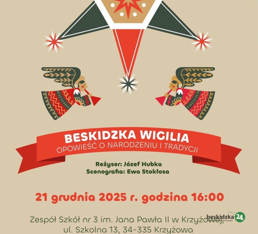 – Będzie to wyjątkowa opowieść nawiązująca do lokalnego dziedzictwa i tradycji świątecznych, łącząca wątek narodzenia z elementami kultury oraz obrzędowości góralskiej. Wydarzenie ma nie tylko charakter artystyczny, ale również edukacyjny, bo to okazja do spotkania z żywą tradycją i przekazem międzypokoleniowym. Reżyserem spektaklu jest Józef Hubka, a za scenografię odpowiada Ewa Stokłosa. Na scenie wystąpią uczniowie szkoły z Krzyżowej, którzy przygotowali przedstawienie w oparciu o motywy i symbole kojarzone z beskidzkim przeżywaniem Wigilii – podkreśla Magdalena Waligóra-Rutkowska, prezes Fundacji Dobry Widok.