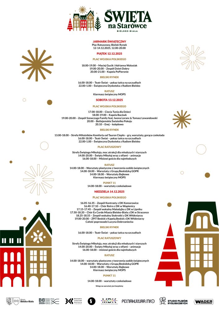 14 grudnia swój program na scenę na placu Wojska Polskiego przygotował Miejski Dom Kultury. O 16.00 wystąpią Kontrasty z DK Komorowice, o 16.40 chór Retro z DK Wapienica, o 17.15 zespół wokalny Melodyjka z DK Lipnik, o 17.50 Chór Ex Corde z DK w Straconce, o 18.25 zespół wokalny Stokrotki z DK Włókniarzy, a o 19.00 ZPiT Beskid z Kapelą Beskid z DK Włókniarzy. Warsztaty dla dzieci z tworzenia ozdób świątecznych odbędą się 13 i 14 grudnia w godzinach 14.00 18.00 w ratuszu przy placu Ratuszowym 1. W Punkcie 11 przy ulicy 11 Listopada 24 zaplanowano warsztaty czekoladowe.