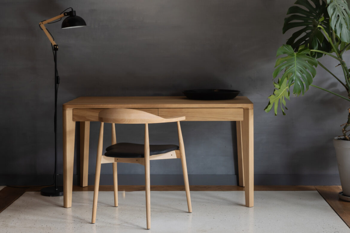 Naturalny materiał sprawia, że mebel nie dominuje przestrzeni, lecz ją uzupełnia. Dzięki temu można stworzyć spójną, estetyczną strefę pracy nawet w niewielkim mieszkaniu.