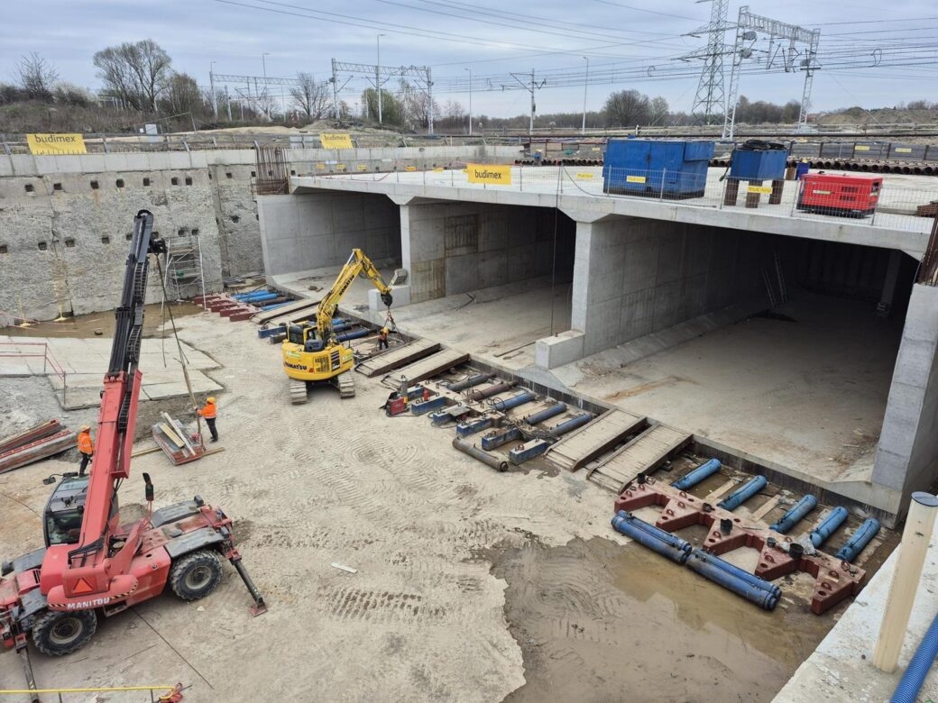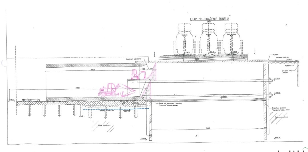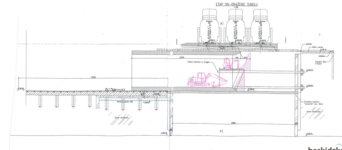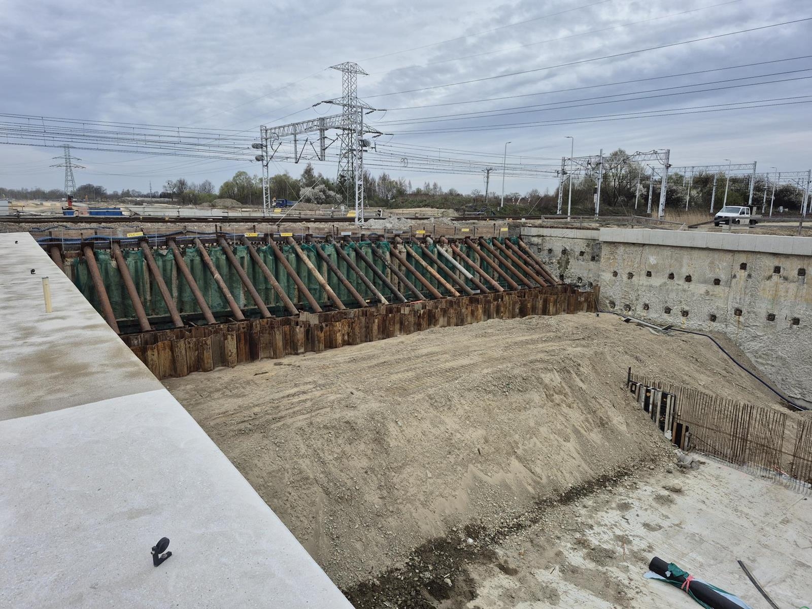 – Taka technologia to pipe-roofing. Wykorzystując ją, przygotowuje się m.in. przejścia dla pieszych w nasypach kolejowych. Jednak jeszcze nikt w Polsce nie budował w ten sposób tak dużego przejazdu pod torami. Betonowy prostopadłościan, który zaczynamy właśnie przeciskać pod torami kolejowymi, ma wymiary 22,7 na 38,7 na 8,5 m i waży ponad 5,5 tysiąca ton. Do jego przesuwania wykorzystamy 60 siłowników, których łączna siła pchania to prawie 8 tysięcy ton. Siłowniki, aby móc przepychać tak ogromny segment, potrzebują odpowiedniego podparcia. My takich punktów podparcia mamy sześć. Każdy z nich to 5-metrowa poprzeczna belka oporowa, która sama jest dodatkowo podparta kolejną belką podłużną, tzw. „ogonem”. Jeden taki zestaw belek podpierający siłowniki jest przymocowany do betonowej płyty dziesięcioma stalowymi sworzniami. Pojedynczy ma średnicę 16 cm i długość 80 cm. Ostatecznie więc siłowniki opierają się o belki, a belki są przymocowane do betonowej płyty. Ta płyta także musi być dobrze przytwierdzona do podłoża. Za jej stabilność odpowiadają 202 pale o średnicy 60 cm i długości 11 m. To one dają nam pewność, że rozpoczynając pchanie segmentu, płyta da odpowiednie podparcie. Siłowniki będą przesuwać segment o 140 cm, a następnie belka będzie odkręcana, przesuwana również o 140 cm w kierunku prostopadłościanu i ponownie przytwierdzana do podłoża. Każdej doby planujemy przesunięcie konstrukcji o 70 cm. Segment będzie stopniowo zagłębiał się w grunt pod torami. Jako pierwsze wbiją się w grunt trzy specjalne, wystające z prostopadłościanu betonowe „ostrza”, znajdujące się na dole, w środku i na górze konstrukcji. Segment jest podzielony w środku na trzy komory, w dwóch będą jezdnie obwodnicy Oświęcimia, w trzeciej ul. Ostatni Etap. W każdej komorze będą pracowały dwie koparki, które w miarę zagłębiania się obiektu w nasyp pod torami będą wybierać z jego wnętrza ziemię. Segment, zagłębiając się coraz bardziej pod tory, będzie się równocześnie w coraz większym stopniu opierał o nasyp kolejowy. Żeby prostopadłościan nie przesunął nasypu, musieliśmy zbudować po drugiej stronie torów specjalną przyporę, która stabilizuje nasyp i utrzymuje go w miejscu. Oczywiście po zakończeniu przeciskania konstrukcji przypora zostanie rozebrana, a w jej miejscu powstaną jezdnie – opisuje cały proces Kacper Michna.
