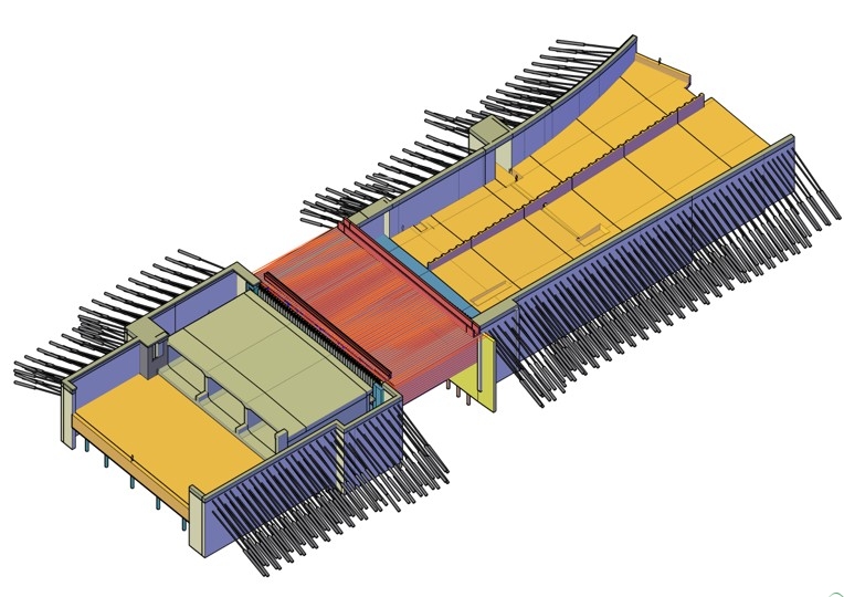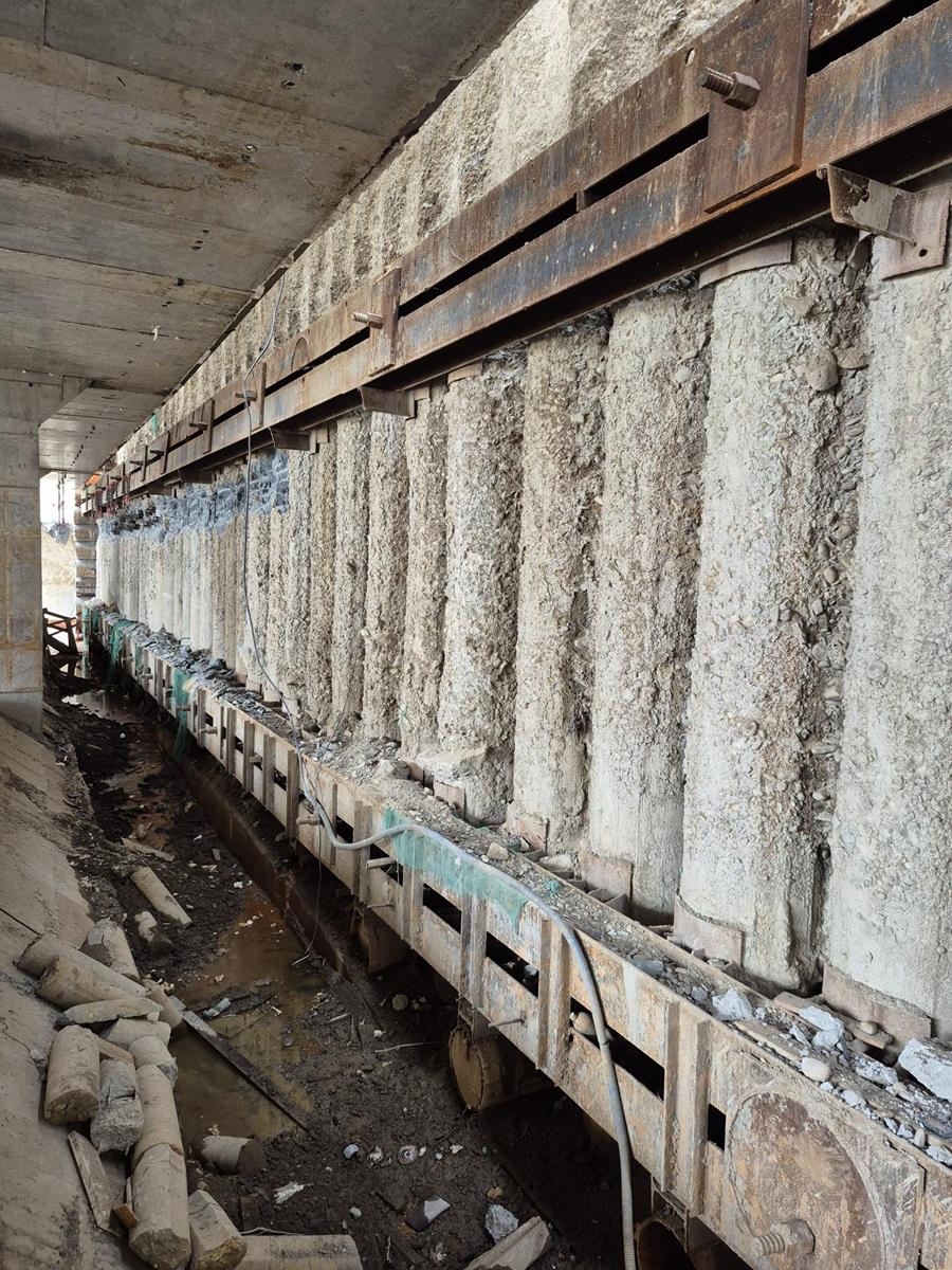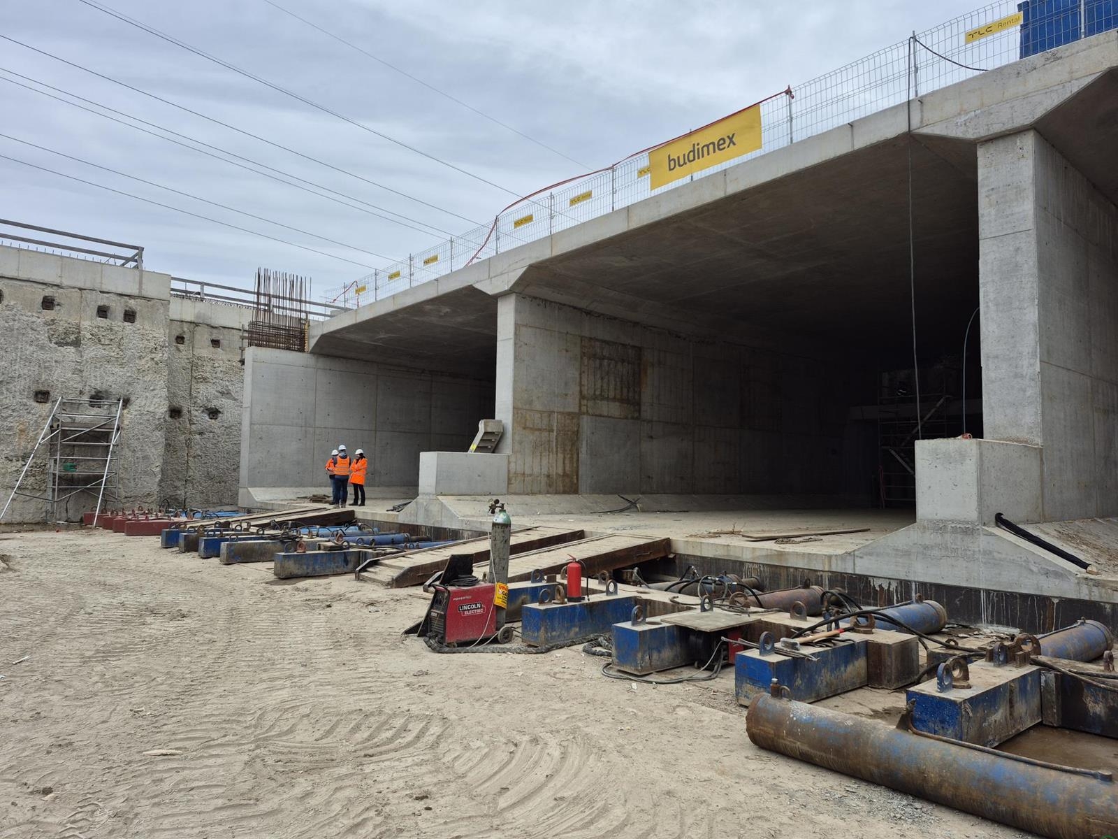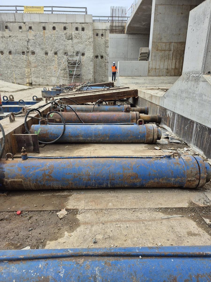 – Taka technologia to pipe-roofing. Wykorzystując ją, przygotowuje się m.in. przejścia dla pieszych w nasypach kolejowych. Jednak jeszcze nikt w Polsce nie budował w ten sposób tak dużego przejazdu pod torami. Betonowy prostopadłościan, który zaczynamy właśnie przeciskać pod torami kolejowymi, ma wymiary 22,7 na 38,7 na 8,5 m i waży ponad 5,5 tysiąca ton. Do jego przesuwania wykorzystamy 60 siłowników, których łączna siła pchania to prawie 8 tysięcy ton. Siłowniki, aby móc przepychać tak ogromny segment, potrzebują odpowiedniego podparcia. My takich punktów podparcia mamy sześć. Każdy z nich to 5-metrowa poprzeczna belka oporowa, która sama jest dodatkowo podparta kolejną belką podłużną, tzw. „ogonem”. Jeden taki zestaw belek podpierający siłowniki jest przymocowany do betonowej płyty dziesięcioma stalowymi sworzniami. Pojedynczy ma średnicę 16 cm i długość 80 cm. Ostatecznie więc siłowniki opierają się o belki, a belki są przymocowane do betonowej płyty. Ta płyta także musi być dobrze przytwierdzona do podłoża. Za jej stabilność odpowiadają 202 pale o średnicy 60 cm i długości 11 m. To one dają nam pewność, że rozpoczynając pchanie segmentu, płyta da odpowiednie podparcie. Siłowniki będą przesuwać segment o 140 cm, a następnie belka będzie odkręcana, przesuwana również o 140 cm w kierunku prostopadłościanu i ponownie przytwierdzana do podłoża. Każdej doby planujemy przesunięcie konstrukcji o 70 cm. Segment będzie stopniowo zagłębiał się w grunt pod torami. Jako pierwsze wbiją się w grunt trzy specjalne, wystające z prostopadłościanu betonowe „ostrza”, znajdujące się na dole, w środku i na górze konstrukcji. Segment jest podzielony w środku na trzy komory, w dwóch będą jezdnie obwodnicy Oświęcimia, w trzeciej ul. Ostatni Etap. W każdej komorze będą pracowały dwie koparki, które w miarę zagłębiania się obiektu w nasyp pod torami będą wybierać z jego wnętrza ziemię. Segment, zagłębiając się coraz bardziej pod tory, będzie się równocześnie w coraz większym stopniu opierał o nasyp kolejowy. Żeby prostopadłościan nie przesunął nasypu, musieliśmy zbudować po drugiej stronie torów specjalną przyporę, która stabilizuje nasyp i utrzymuje go w miejscu. Oczywiście po zakończeniu przeciskania konstrukcji przypora zostanie rozebrana, a w jej miejscu powstaną jezdnie – opisuje cały proces Kacper Michna.