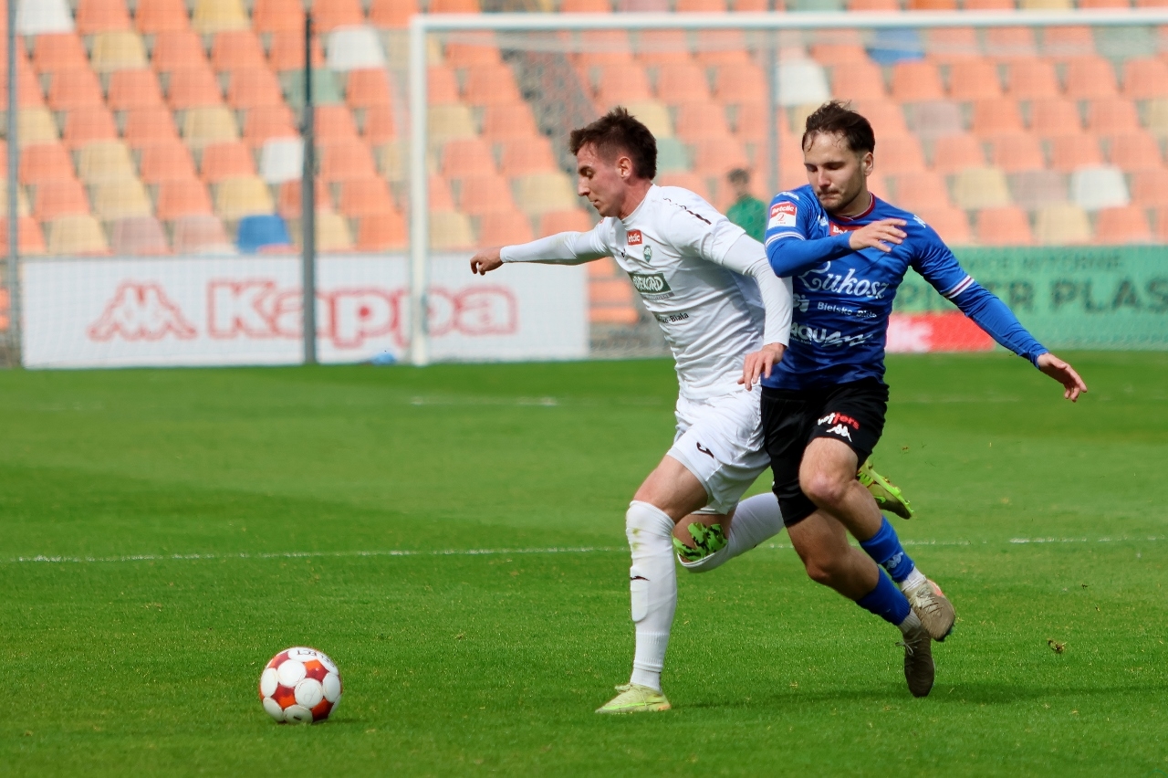 W pierwszej połowie było sporo walki, ale klarownych sytuacji jak na lekarstwo. Kibice obejrzeli piłkarskie szachy, w które jednak lepiej grali goście. W 8. minucie Krzysztof Kolanko mógł dać “Góralom” prowadzenie, ale przegrał pojedynek z golkiperem Rekordu Wiktorem Kaczorowskim. Co się odwlecze, to nie uciecze i w 20. minucie Krzysztof Kolanko wiedział jak trafić do siatki, skutecznie dobijając zatrzymany przez bramkarza strzał Oskara Tomczyka. W 45. minucie szansę na gola miał Dalibor Takáč, ale z jego próbą Wiktor Kaczorowski sobie poradził.