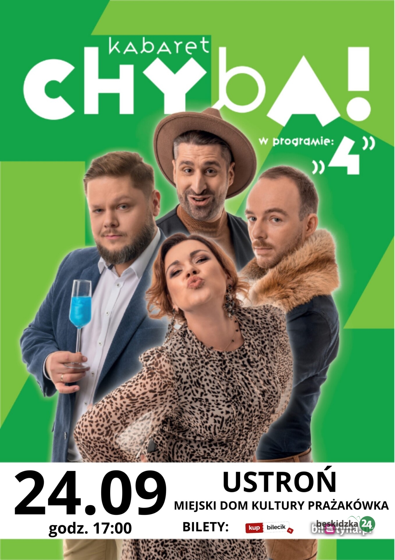 24 września ustrońską publiczność bawić będzie pochodzący z Wrocławia Kabaret Chyba, w swoim najnowszym programie pt. “4”. Na scenie od 2023 roku, ma na swoim koncie wiele prestiżowych nagród. Uznawany jest za jeden z najzdolniejszych kabaretów młodego pokolenia. Jego członkowie zgarnęli nagrody na wszystkich najważniejszych festiwalach w Polsce. Kabaret Chyba wygrał m.in. słynny krakowski festiwal PAKA, zdobył Grand Prix na festiwalu Przewałka w Wałbrzychu, był laureatem na Lidzbarskich Wieczorach Humoru i Satyry.