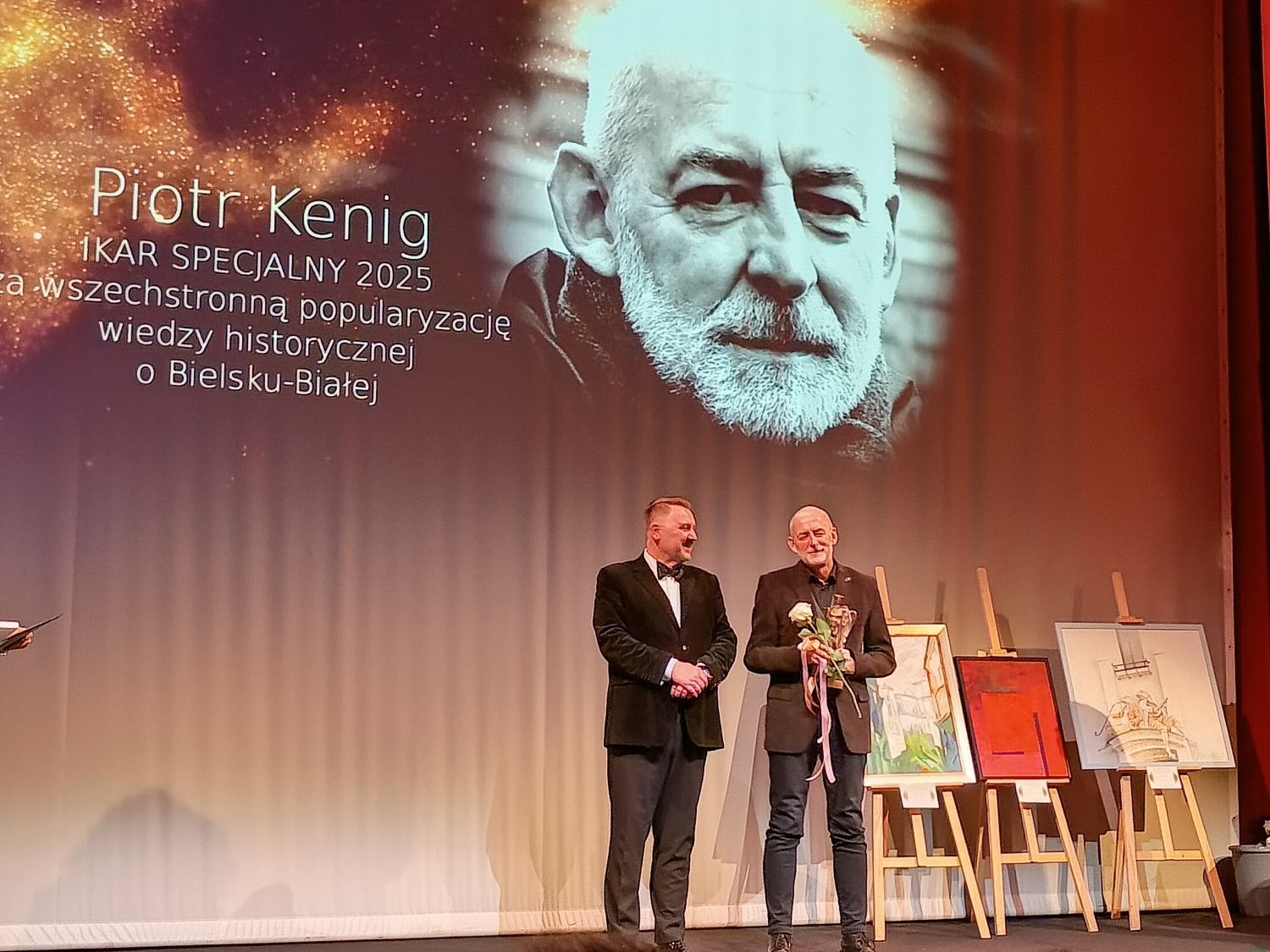 Ikara Specjalnego 2025 za wszechstronną popularyzację wiedzy historycznej o Bielsku-Białej przyznano Piotrowi Kenigowi, historykowi oraz wieloletniemu kustoszowi i kierownikowi Starej Fabryki – Oddziału Muzeum Historycznego w Bielsku-Białej. – Piotr Kenig to autor licznych publikacji upowszechniających dziedzictwo historyczne Bielska-Białej. Jest autorytetem w dziedzinie lokalnej historii, dziejów przemysłu na terenie naszego miasta oraz historii rodów fabrykantów. Jest także cenionym wykładowcą, edukatorem i przewodnikiem po Bielsku-Białej. Inicjował i współtworzył siedem z dziewięciu historycznych szlaków tematycznych na terenie miasta, które obejmują prawie 140 obiektów i miejsc związanych z naszym dziedzictwem – wymieniała Oriana Soika. – Jako bielszczanin od dzieciństwa kocham to miasto i jego historia zawsze mnie fascynowała – mówił Piotr Kenig. – Początkowo planowałem pracować w budownictwie, ale dzięki wspaniałym ludziom, których spotykałem na mojej drodze, w końcu zostałem historykiem i muzealnikiem w Bielsku. Dziękuję więc wszystkim tym, którzy umożliwili mi robienie tego, co kocham. Ogromnie się cieszę, że ludzie interesują się tymi rzeczami, które dane mi było znaleźć, odkryć, opisać i przedstawić oraz że mam możliwość oprowadzania po mieście i prowadzenia różnych prelekcji.