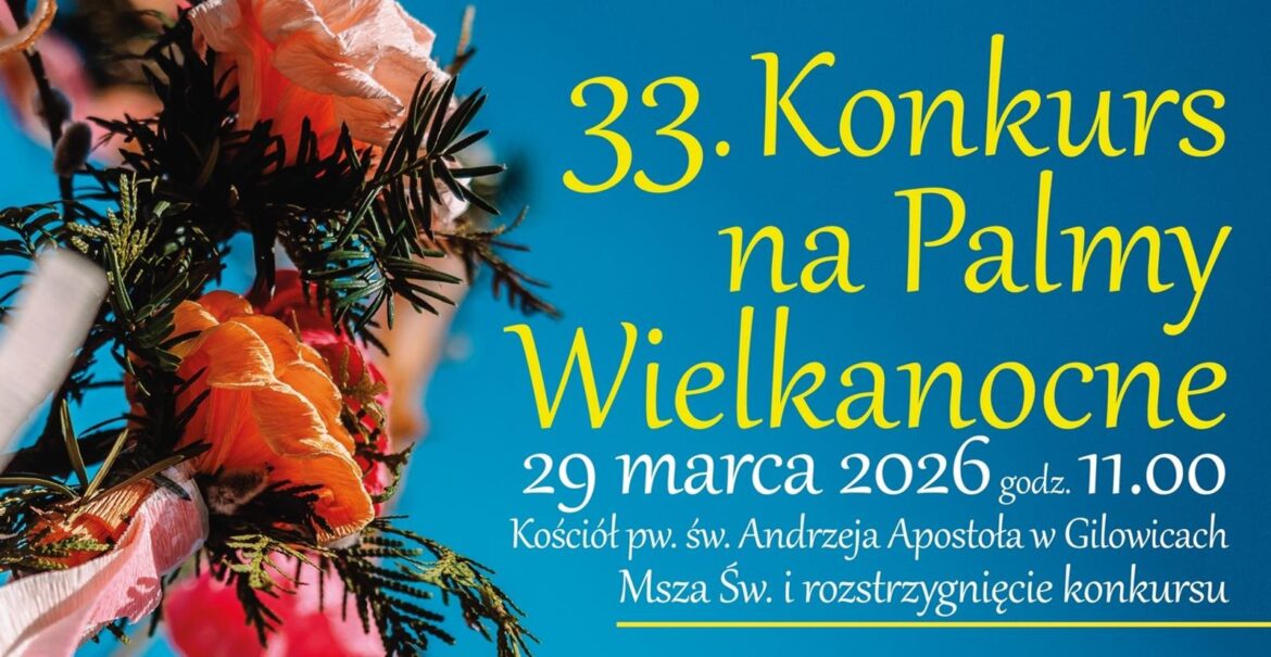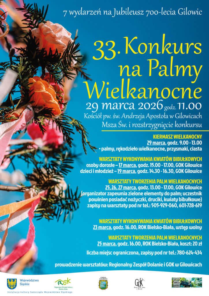 W tym roku będzie to już 33. edycja tego najsłynniejszego konkursu na Żywiecczyźnie, który został zapoczątkowany w 1994 roku. Konkurs będzie miał miejsce 29 marca o 11.00, a jego rozstrzygnięcie nastąpi po mszy w zabytkowym kościele św. Andrzeja Apostoła w centrum Gilowic. Jak informuje Sabina Słowiak-Wandzel z Regionalnego Ośrodka Kultury w Bielsku-Białej, przed konkursem odbędzie się szereg warsztatów z wykonywania tradycyjnych kwiatów bibułkowych oraz tworzenia palm wielkanocnych. Będą one organizowane zarówno przez Gminny Ośrodek Kultury w Gilowicach, jak Regionalny Ośrodek Kultury w Bielsku-Białej.