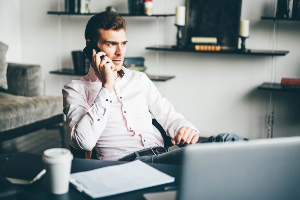 Thoughtful man sitting with feet on table and talking on phone in modern office. Stressed businessman calling on a mobile phone.