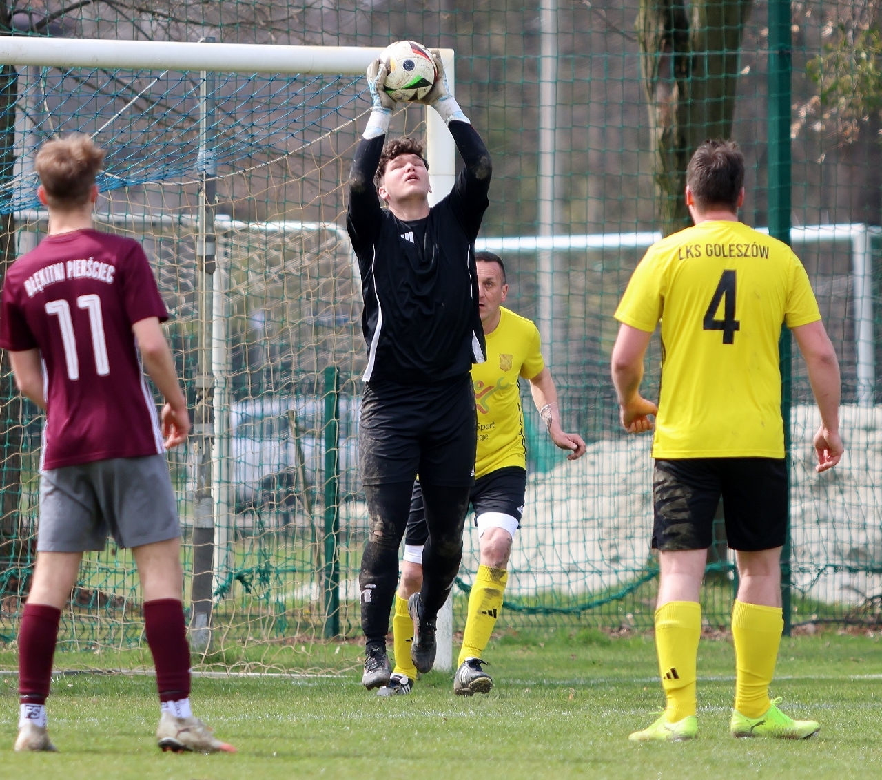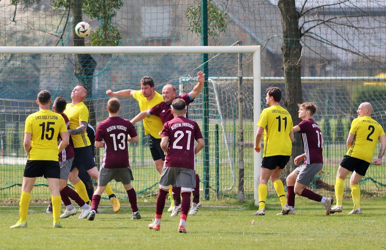 Po zmianie stron Goleszowianie próbowali odrobić jednobramkowy deficyt, ale zawodziła ich skuteczność lub ostatnie podanie. Miejscowi też nie odpuszczali i po jednym z ich natarć, w 70. minucie, defensor LKS-u zagrał piłkę ręką w polu karnym, co skończyło się “jedenastką” dla Błękitnych. Tą skutecznie wyegzekwował Kacper Gawlas i było 2:0. 3 minuty później goście zdobyli bramkę kontaktową, gdy mocnym uderzeniem pod poprzeczkę popisał się Mateusz Wigezzi. Chwilę później lider mógł odpowiedzieć, ale Nikodem Penkala trafił tylko w słupek. Ekipa spod Chełmu atakowała, próbując wyrównać, ale zamiast gola na 2:2, padła bramka na 3:1, która zamknęła mecz. Na listę strzelców wpisał się Nikodem Penkala i trzy punkty zostały w Pierśćcu.