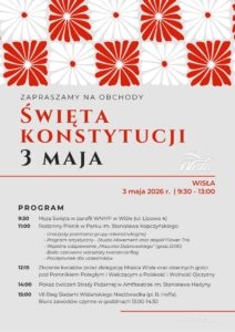 Wisła włączy się w obchody Narodowego Święta Konstytucji 3 Maja. Dzień rozpocznie się Mszą Świętą o godzinie 9:30 w parafii WNMP w centrum miasta. Następnie wydarzenia przeniosą się do Parku Kopczyńskiego, gdzie od godziny 11:00 odbędzie się Rodzinny Piknik. w programie m.in. przemarsz grupy rekonstrukcyjnej, występy artystyczne, wspólne odśpiewanie hymnu oraz warsztaty biało czerwone dla najmłodszych i mały poczęstunek.