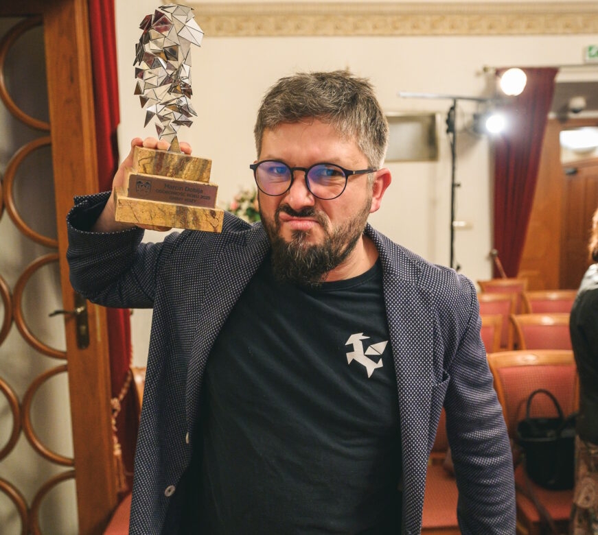 Marcin Dobija ze statuetką. Fot. FB Gminna Biblioteka Publiczna w Kozach