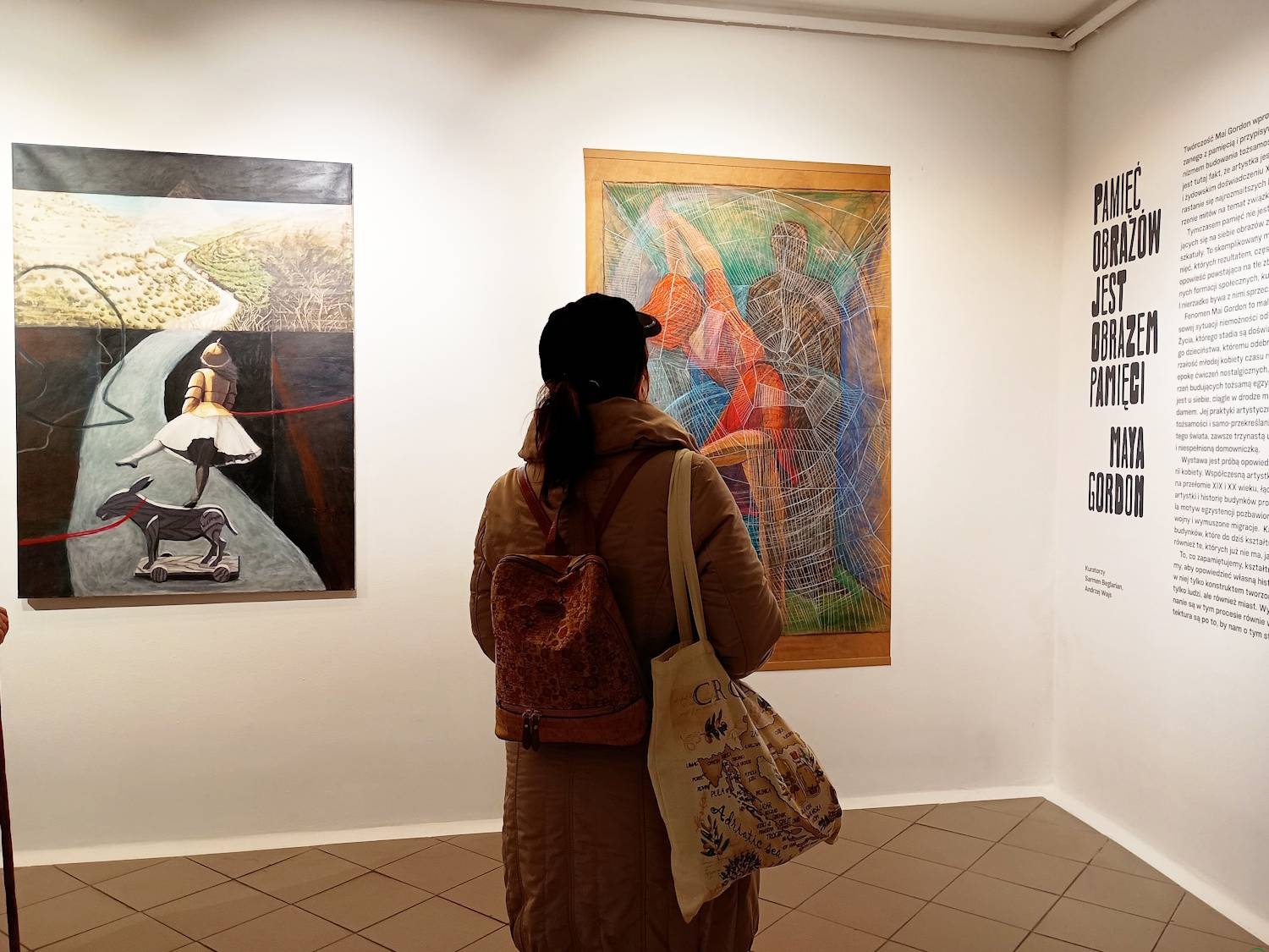 Wystawa zatytułowana jest „Pamięć obrazów jest obrazem pamięci” i prezentuje głównie prace malarskie Mai Gordon. To artystka pochodzenia polskiego i żydowskiego, która urodziła się w Chorzowie w 1947 roku. Jako dziesięcioletnia dziewczynka razem z rodziną wyemigrowała do Izraela, natomiast w 1970 roku wyjechała na stałe do Holandii. Dziś mieszka w Warszawie, Tel Awiwie i Amsterdamie, a w jej pracach artystycznych nieustannie przewija się motyw bycia obcą i przyjezdną, podróżniczką i niespełnioną domowniczką. Jej twórczość to opowieść o niemożności połączenia kolejnych faz życia w spójną całość.
