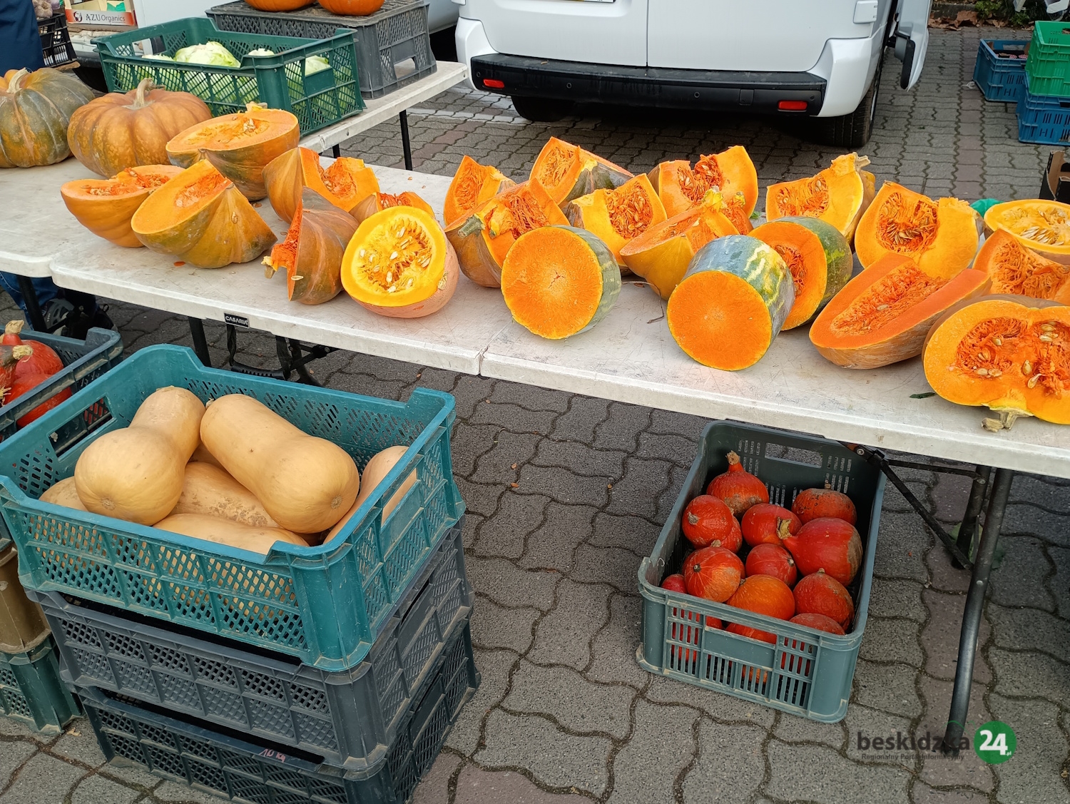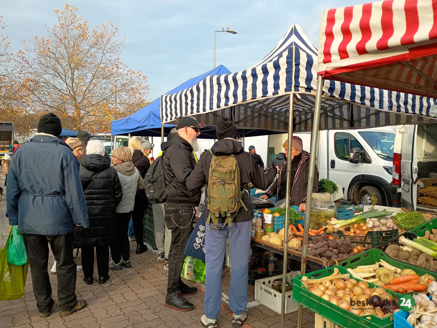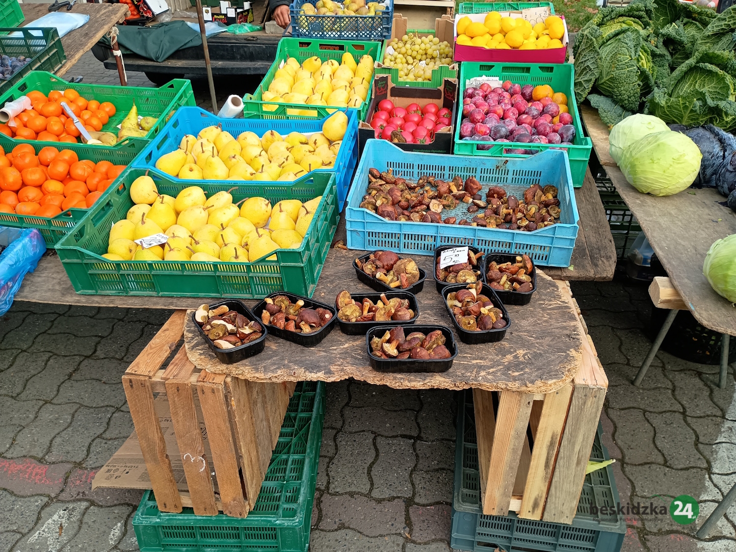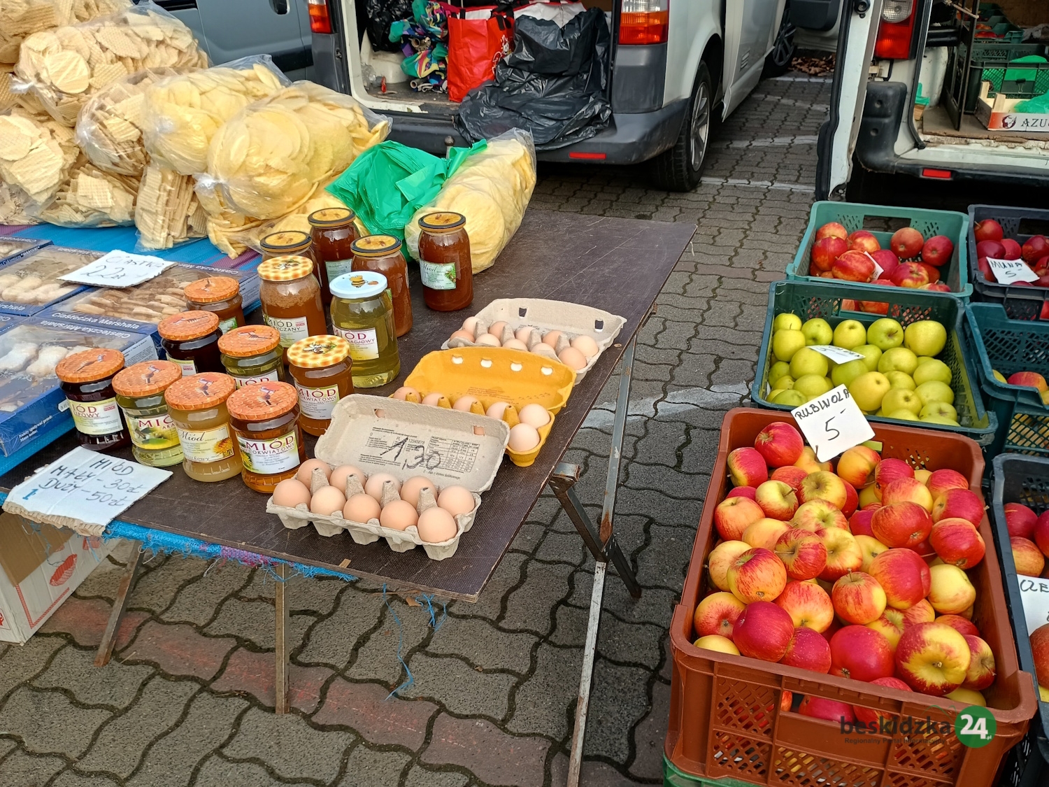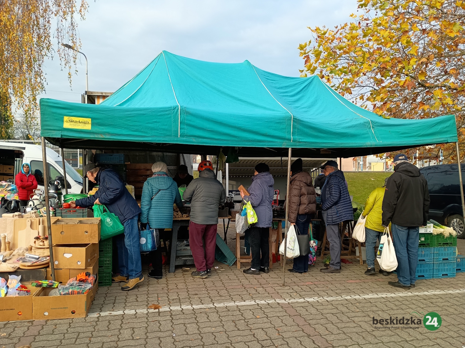 Gdy odwiedzamy plac targowy w sobotę, 8 listopada przed 9.00, pan Marek z gospodarstwa rolnego w Trzebini ma już prawie wszystko wyprzedane. – Specjalizujemy się w produktach nabiałowych – opowiada. – Są to sery kozie i krowie, jogurty, kefiry, śmietana oraz mleko, również od krów rasy jersey, uznawanej za najlepszą jeśli chodzi o jakość mleka. Mamy też swojskie jajka. Jesteśmy tu zawsze w czwartki i soboty od 6.00 do godzin przedpołudniowych. Klienci najczęściej przychodzą już rano, więc towar szybko znika.