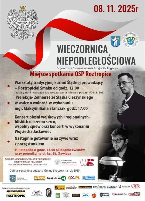 Po południu, o godz. 17.00, odbędzie się z kolei prelekcja Maksymiliana Stańczaka, historyka młodego pokolenia, który przybliży historię żołnierzy ze Śląska Cieszyńskiego walczących o wolność. Następnie rozpocznie się koncert pieśni wojskowych i regionalnych „bliskich naszemu sercu”, po czym zebranym zaprezentuje się muzycznie Wojciech Jackowiec. Imprezę dofinansowaną m.in. przez Ministerstwo Obrony Narodowej oraz gminę Skoczów, zakończy gotowanie na żywo wraz z poczęstunkiem.