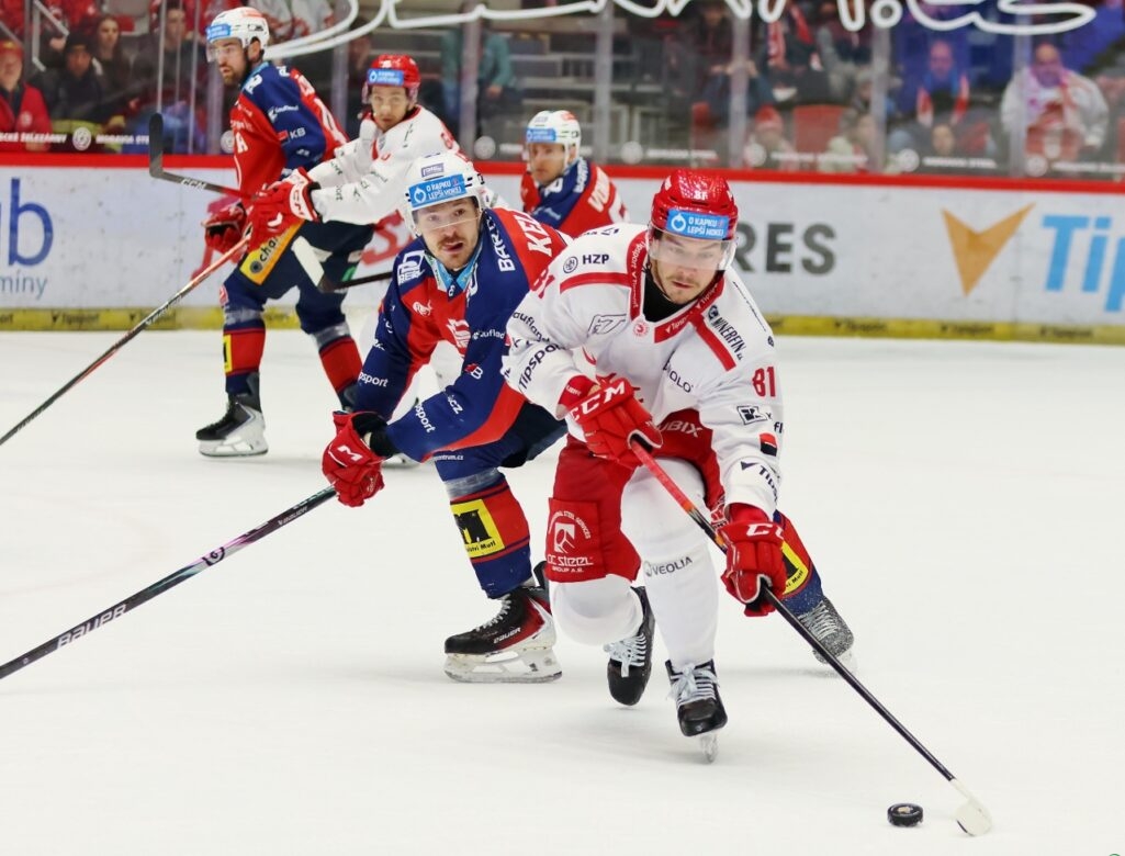 Na pierwszego gola finałów kibice w pardubickiej Enteria Arena czekali aż do 30. minuty, gdy wynik otworzył Jan Mandát. Gospodarze długo się nie cieszyli z prowadzenia, bo zaledwie po 68 sekundach był remis. Oscar Flynn wyrównał a „Stalownicy” poszli za ciosem. W 39. minucie Ondřej Kovařčík trafił do siatki przeciwnika i druga tercja zakończyła się rezultatem 2:1 dla czerwono-białych.
