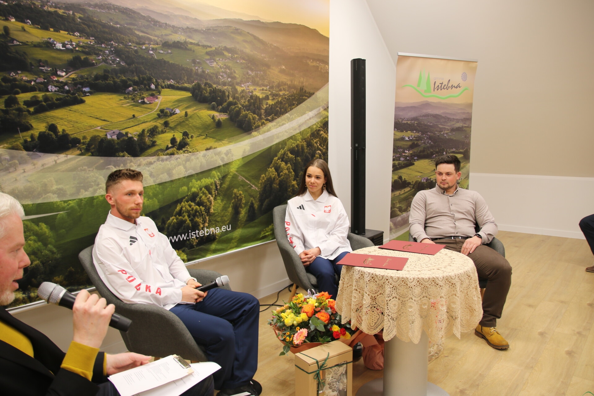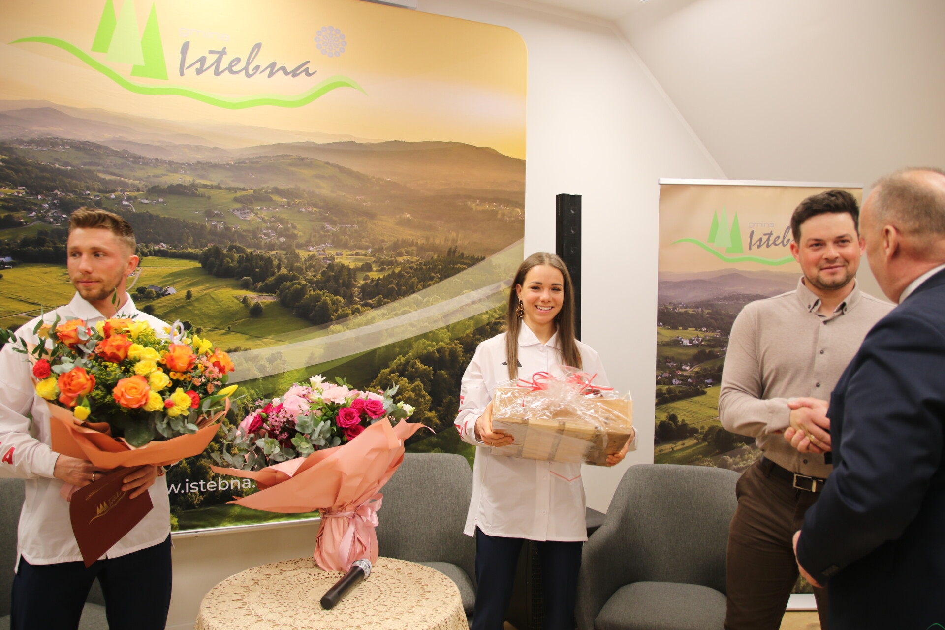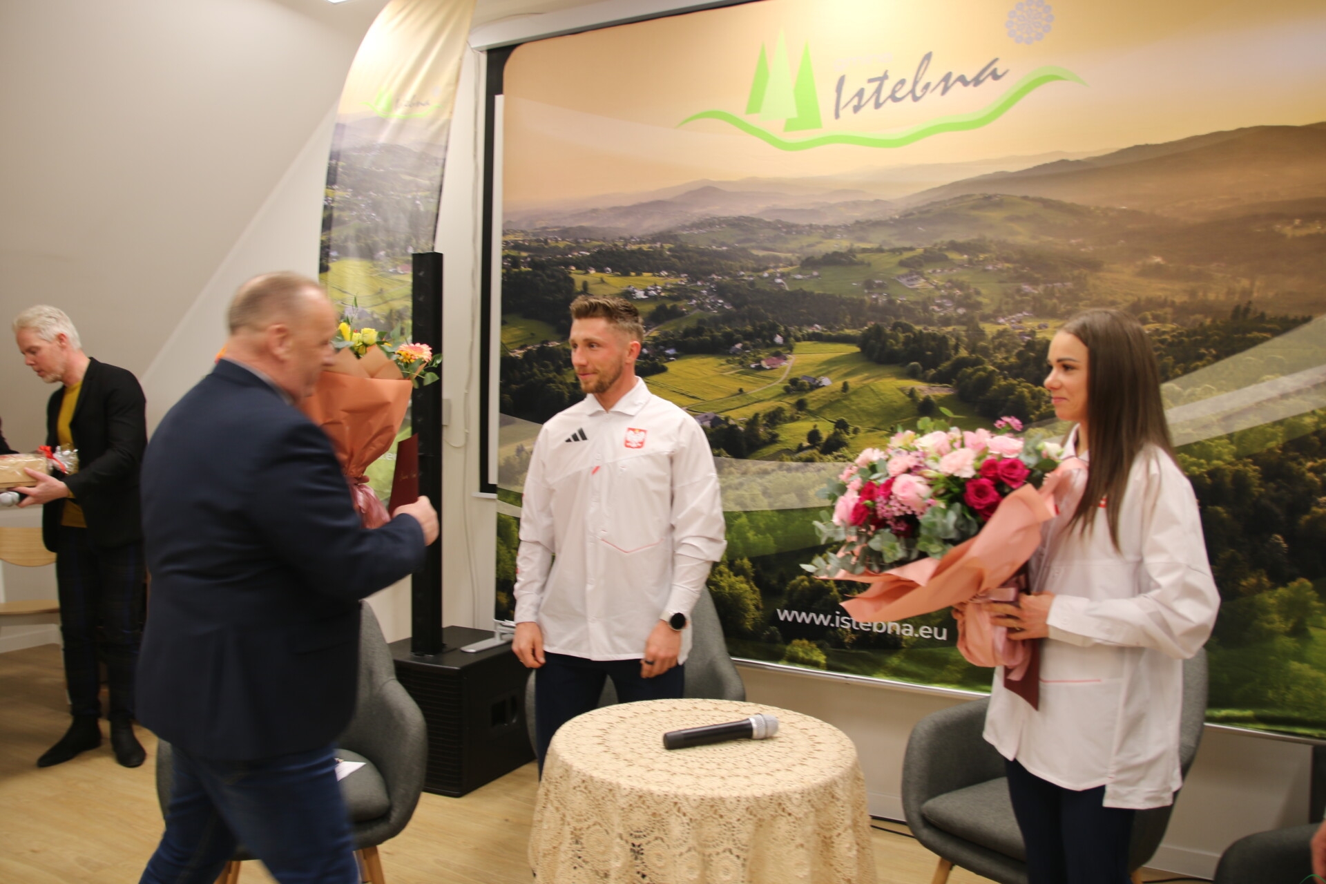 Uroczyste, ale i merytoryczne powitanie odbyło się w Gminnym Ośrodku Kultury i Promocji w Istebnej. Jego bohaterami byli oczywiście biegacze narciarscy: Eliza Rucka-Michałek, Dominik Bury oraz trener i prywatnie mąż Elizy — Mikołaj Michałek.