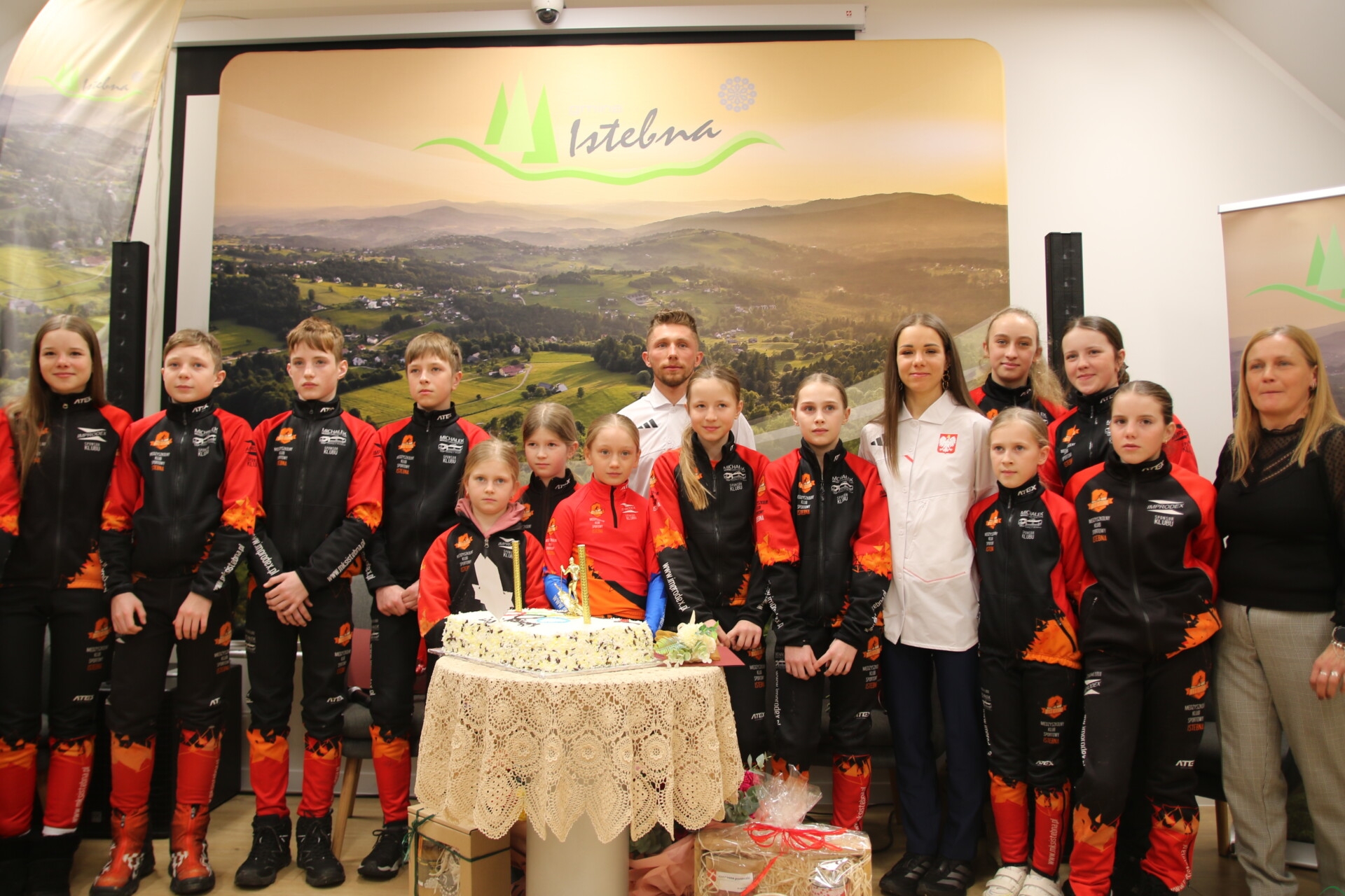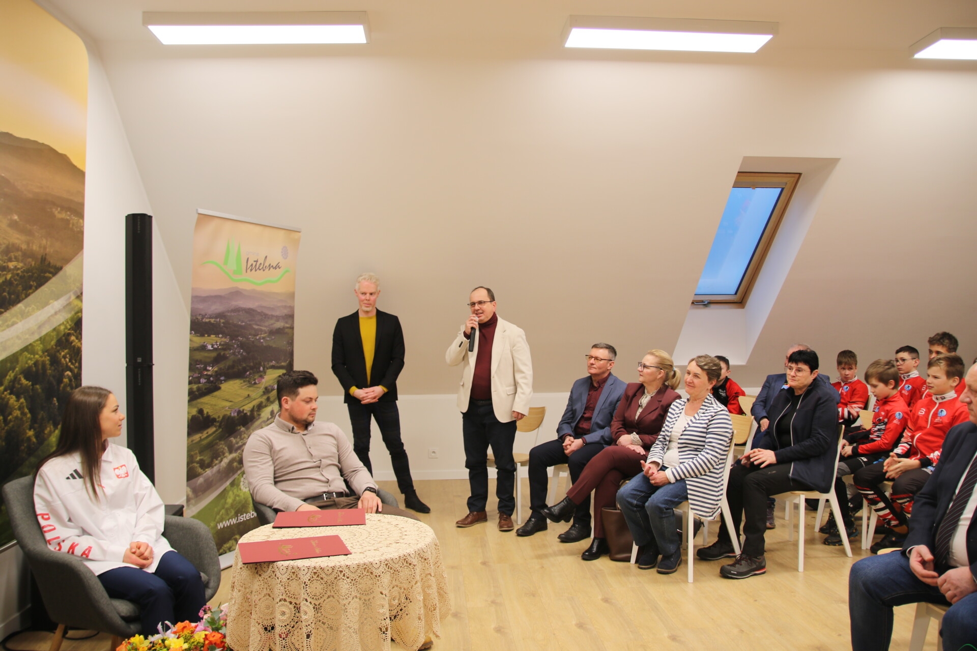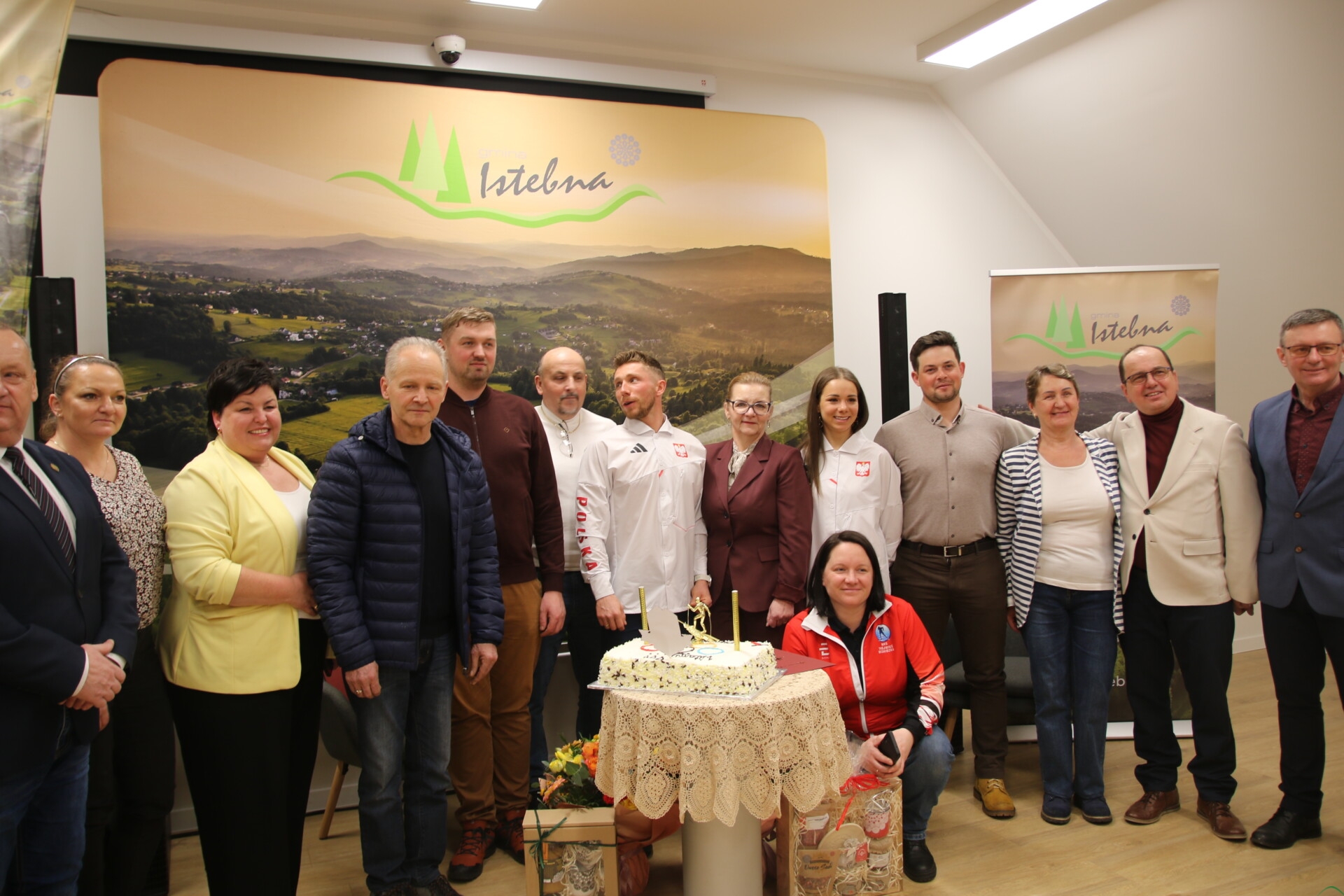Uroczyste, ale i merytoryczne powitanie odbyło się w Gminnym Ośrodku Kultury i Promocji w Istebnej. Jego bohaterami byli oczywiście biegacze narciarscy: Eliza Rucka-Michałek, Dominik Bury oraz trener i prywatnie mąż Elizy — Mikołaj Michałek.