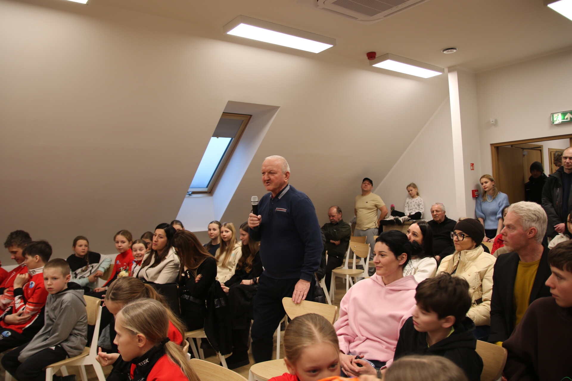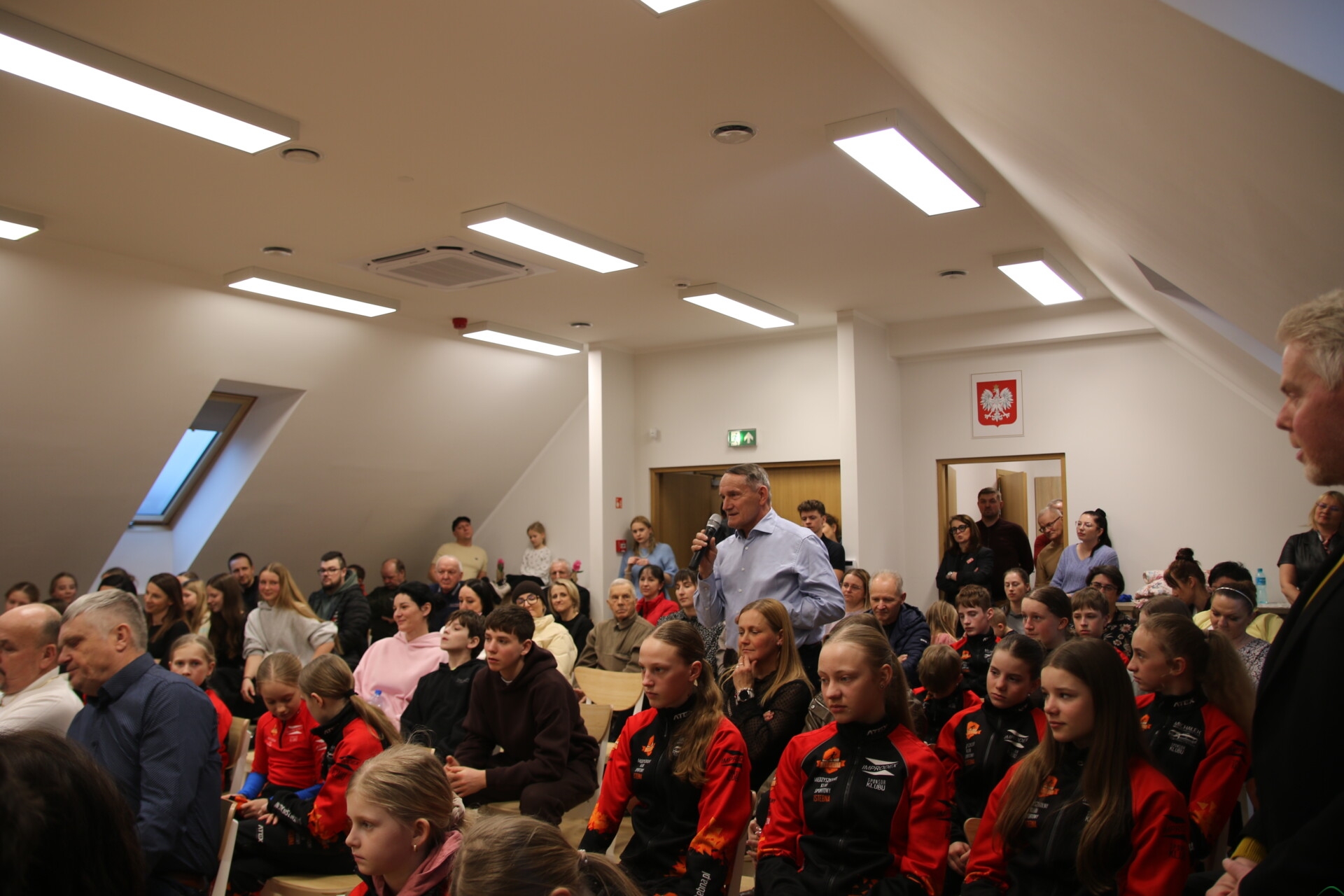 Przywitał ich wójt, a w dalszej części biegacze i trener byli przepytywani najpierw przez prowadzącego spotkanie Tadeusza Papierzyńskiego, a następnie przez mieszkańców — odpowiadali na pytania i dzielili się przeżyciami. Nie zabrakło poruszania tematów niełatwych, jak stosunek PZN do indywidualnych przygotowań Elizy, o czym pisaliśmy TUTAJ, czy niepowołanie na igrzyska Kamila Burego.