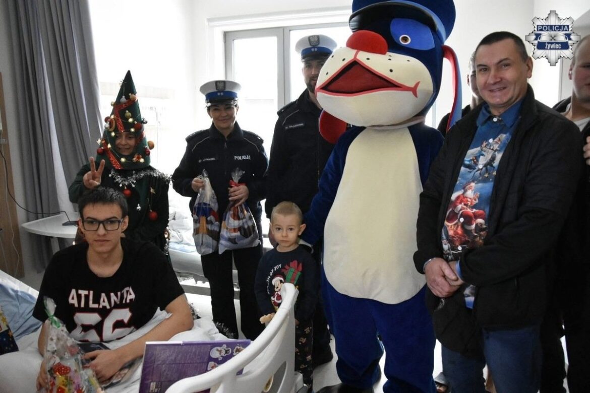 Żywieccy policjanci przynieśli prezenty małym pacjentom oddziału pediatrycznego szpitala w Żywcu. Dzieci nie kryły radości, tym bardziej, że mundurowym towarzyszyła policyjna maskotka, czyli Sznupek.