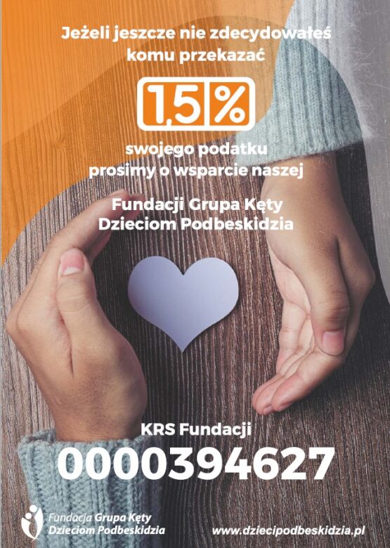 Zapraszamy i zachęcamy do przekazania swojego 1,5% podatku na rzecz Fundacji Grupa Kęty Dzieciom Podbeskidzia. Państwa pomoc ma realny wpływ na lepszą przyszłość naszych podopiecznych – szczególnie w tym wyjątkowym, jubileuszowym roku.