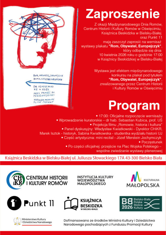 Z okazji Międzynarodowego Dnia Romów, 10 kwietnia o godz. 17.00 w Książnicy Beskidzkiej odbędzie się wernisaż wystawy plakatów „Rom, Obywatel, Europejczyk”. – Wydarzenie jest ważnym głosem w debacie o współczesnej tożsamości mniejszości romskiej. Spotkanie połączy prezentację dzieł artystów z wielu krajów z dyskusją o przełamywaniu społecznych stereotypów – przybliżają organizatorzy.