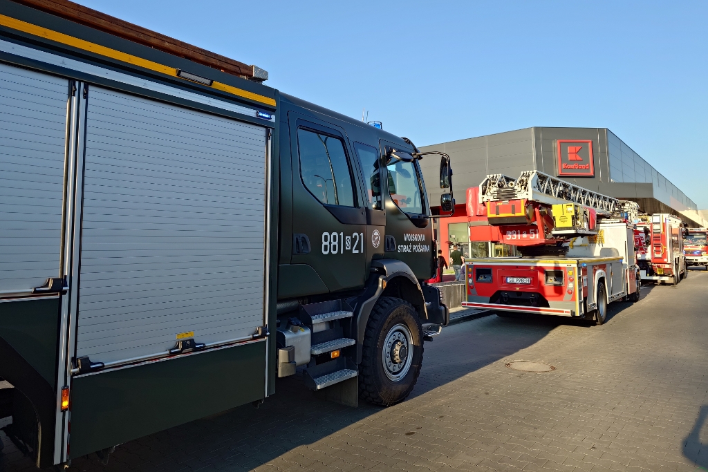Gdy akcja gaśnicza blaszanej wiaty z różnymi częściami samochodowymi dobiegała końca, do dyżurnego SKKM wpłynęło zgłoszenie alarmu z systemu monitoringu przeciwpożarowego w centrum handlowym przy ul. Warszawskiej. Na miejsce wysłano pięć zastępów straży pożarnej. Również w tym przypadku samochody bojowe strażaków przejeżdżały alarmowo przez Rondo Solidarności.