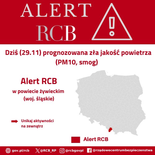 „Uwaga! Dziś (29.11) prognozowana jest zła jakość powietrza w zakresie pyłu zawieszonego PM10 (smog). Unikaj aktywności na zewnątrz” – ostrzeżenie o tej treści odebrała dziś część mieszkańców i turystów w regionie. „Alert został wysłany do odbiorców przebywających na terenie powiatu żywieckiego (woj. śląskie)” – czytamy na stronie Rządowego Centrum Bezpieczeństwa.