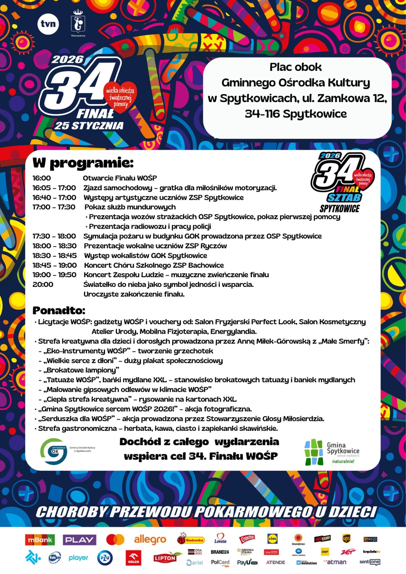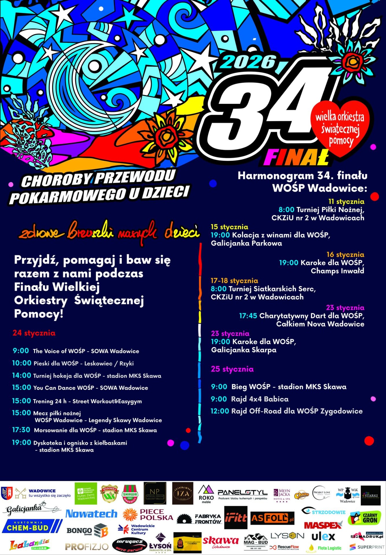 Podczas tegorocznego finału WOŚP, który odbywa się pod hasłem „Zdrowe brzuszki naszych dzieci”, pieniądze zbierane będą z przeznaczeniem na wsparcie diagnostyki i leczenia chorób przewodu pokarmowego u dzieci. W powiecie wadowickim działa pięć sztabów: Szkoła Podstawowa nr 2 w Andrychowie (szef Krzysztof Paczyński), Ochotnicza Straż Pożarna w Brzeźnicy (szef Łukasz Polanek), Centrum Kultury, Sportu i Turystyki w Kalwarii Zebrzydowskiej (szef Andrzej Burdek), Gminny Ośrodek Kultury w Spytkowicach (szef Ewelina Kubarek) i Hufiec Ziemi Wadowickiej w Wadowicach (szef Kamil Kowalczyk).