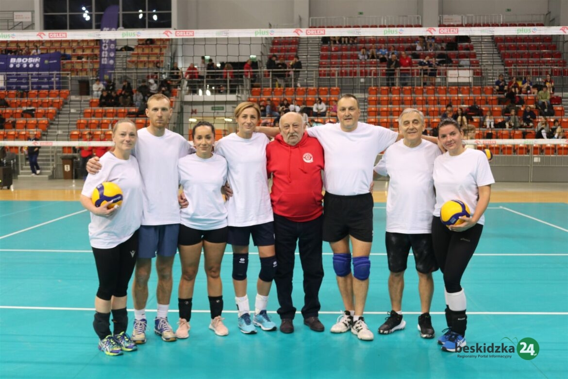 Tradycyjnie na początku głos zabrali organizatorzy i osoby związane z inicjatywą od jej pierwszych dni. Piotr Wysocki, wieloletni prezes Wydawnictwa Prasa Beskidzka i jeden z pomysłodawców turnieju, przypomniał historię przedsięwzięcia: – Przez 15 lat, nawet w okresie pandemii, prowadziliśmy te rozgrywki. Na początek zawsze odbywa się mecz pokazowy – choć może nie do końca pokazowy, bo to mecz VIP-ów. Tradycyjnie występuje drużyna redakcji „Kroniki Beskidzkiej” z przyjaciółmi, a po drugiej stronie siatki – Urząd Miejski. Popatrzcie, jak oni grają. W składach tych zespołów są co najmniej dwie osoby, które mają 50 lat więcej niż wy. Wyobraźcie sobie, jak siatkówka konserwuje znakomicie! – mówił z uśmiechem do zgromadzonej na hali młodzieży.