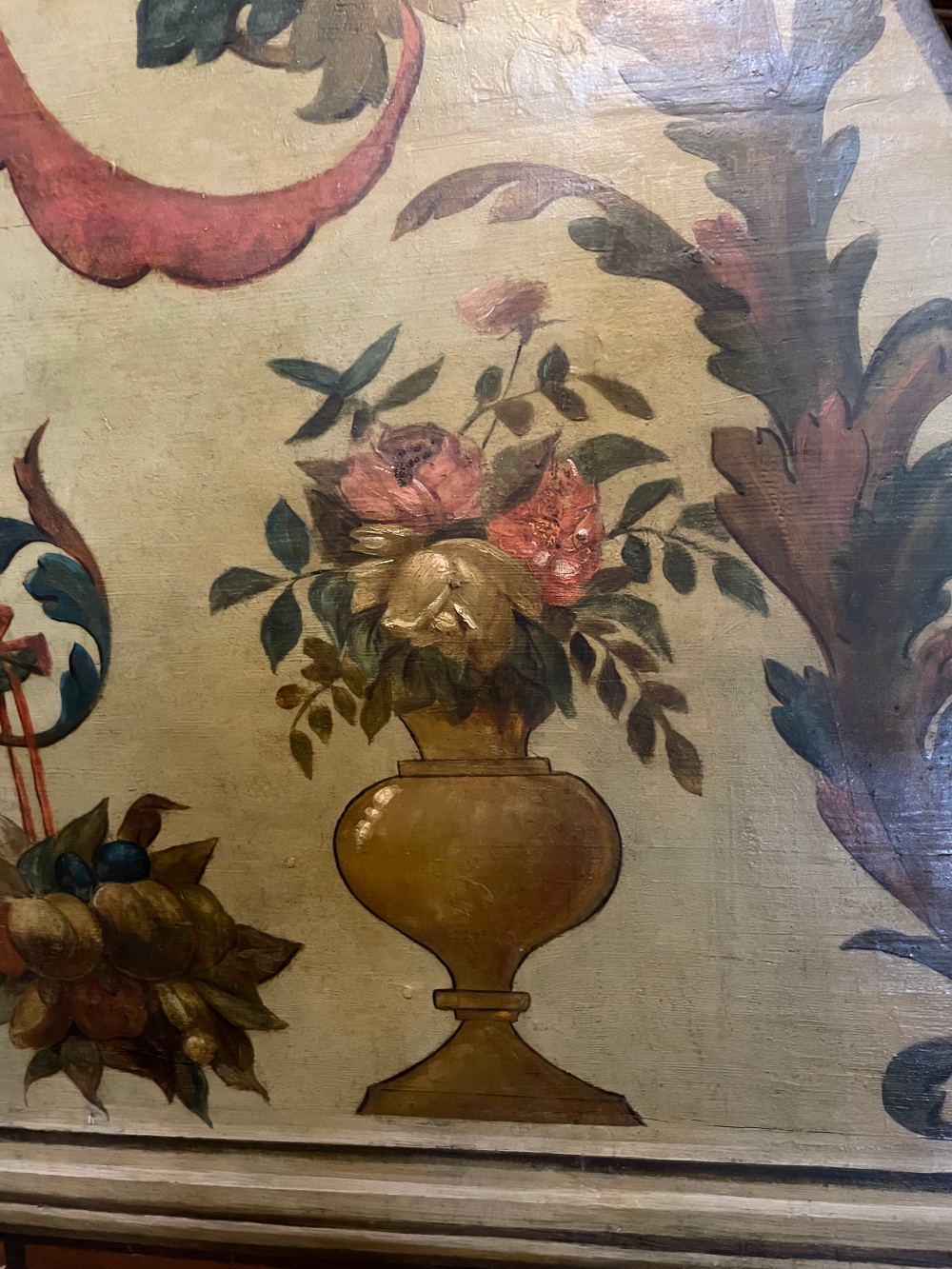 Historyk sztuki wyjaśnia, że górna partia dekoracji przybiera formę fantazyjnej arkady zwieńczonej krzyżem. Wypełnia ją bogata ornamentyka arabeskowa, w której centrum umieszczono kartusz z napisem „Grób Jego będzie chwalebny”, podtrzymywany przez dwa aniołki trzymające narzędzia Męki Pańskiej. Całość uzupełniają girlandy, motywy roślinne, stylizowane maski oraz bukiety róż w wazach.