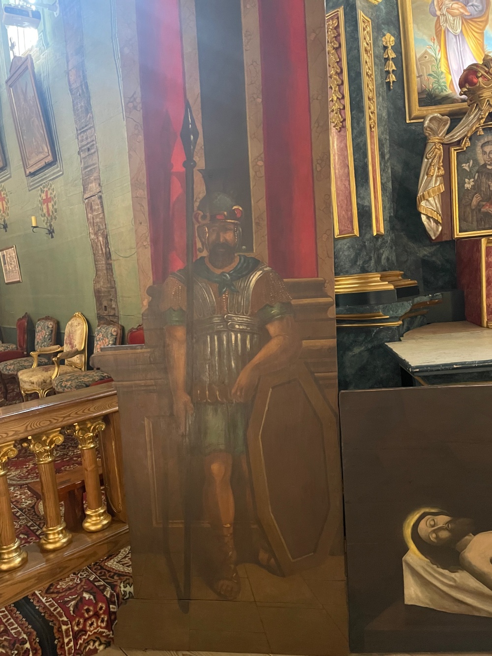 „Postacie te, przedstawione w lekkim kontrapoście, odziane są w antyczne zbroje i uzbrojone w włócznie oraz tarcze. Zwraca uwagę ich naturalistyczne ujęcie, swoboda malarska oraz umiejętne operowanie światłem, które wydobywa metaliczne elementy uzbrojenia i buduje głębię przedstawienia poprzez subtelnie zaznaczone cienie” – opisuje ks. Tracz.