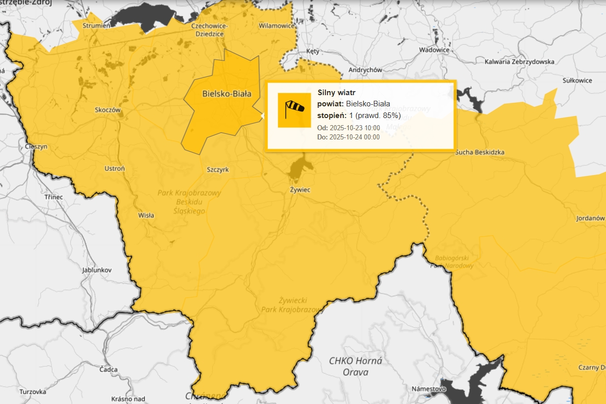 Ostrzeżenie dotyczy Bielska-Białej, a ponadto powiatów bielskiego, cieszyńskiego, suskiego i żywieckiego.