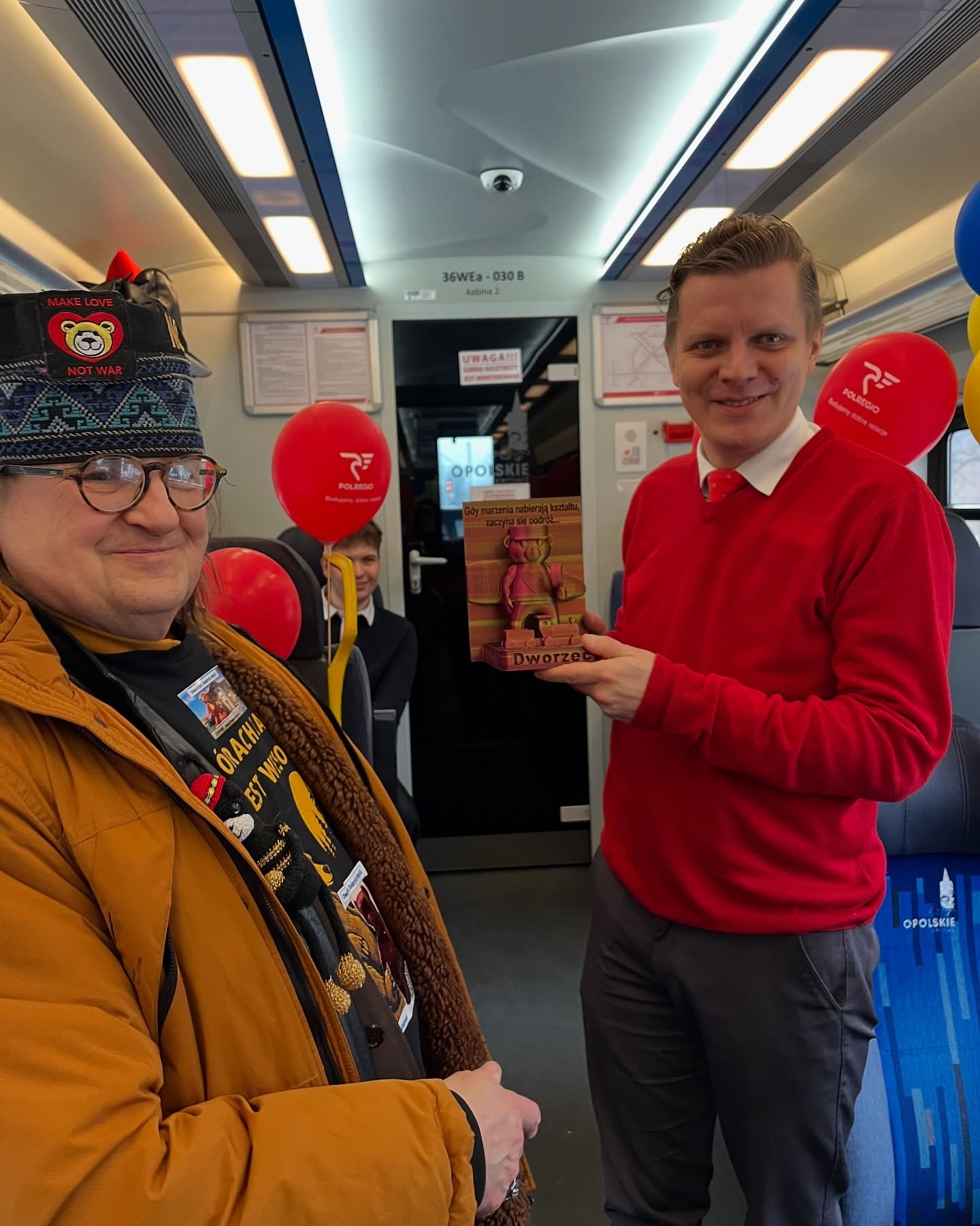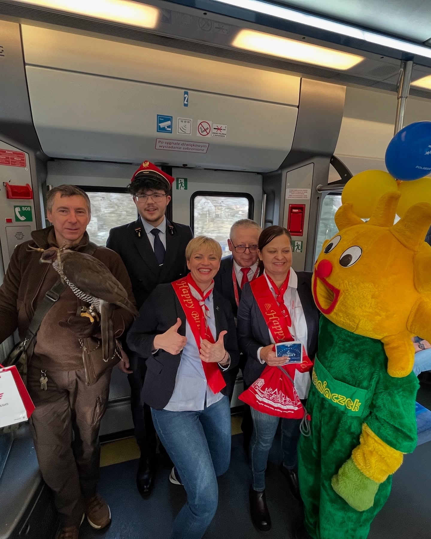 Kolejne atrakcje czekały w Ustroniu – tam na pokład “Malinki” wsiadła wesoła ekipa, w tym m.in. maskotka miasta Ustroniaczek, a także sokolnik Tomek z Emilką – najprawdziwszym jastrzębiem z Leśnego Parku Niespodzianek w Ustroniu. Na podróżnych czekały także pyszne rogaliki z lokalnej piekarni. Nie brakło też pluszowej reprezentacji misiów z Dworca Dobrych Myśli w Ustroniu z Brunonem Zielonką na czele. W pociągu czekał również Konduktor Przemek – Przemysław Brych, znany w całej Polsce popularyzator kolei pochodzący ze Śląska Cieszyńskiego. W drogę powrotną “Malinka” wyruszy dziś z Wisły Głębce o godz. 15.59, by dotrzeć do Wrocławia.