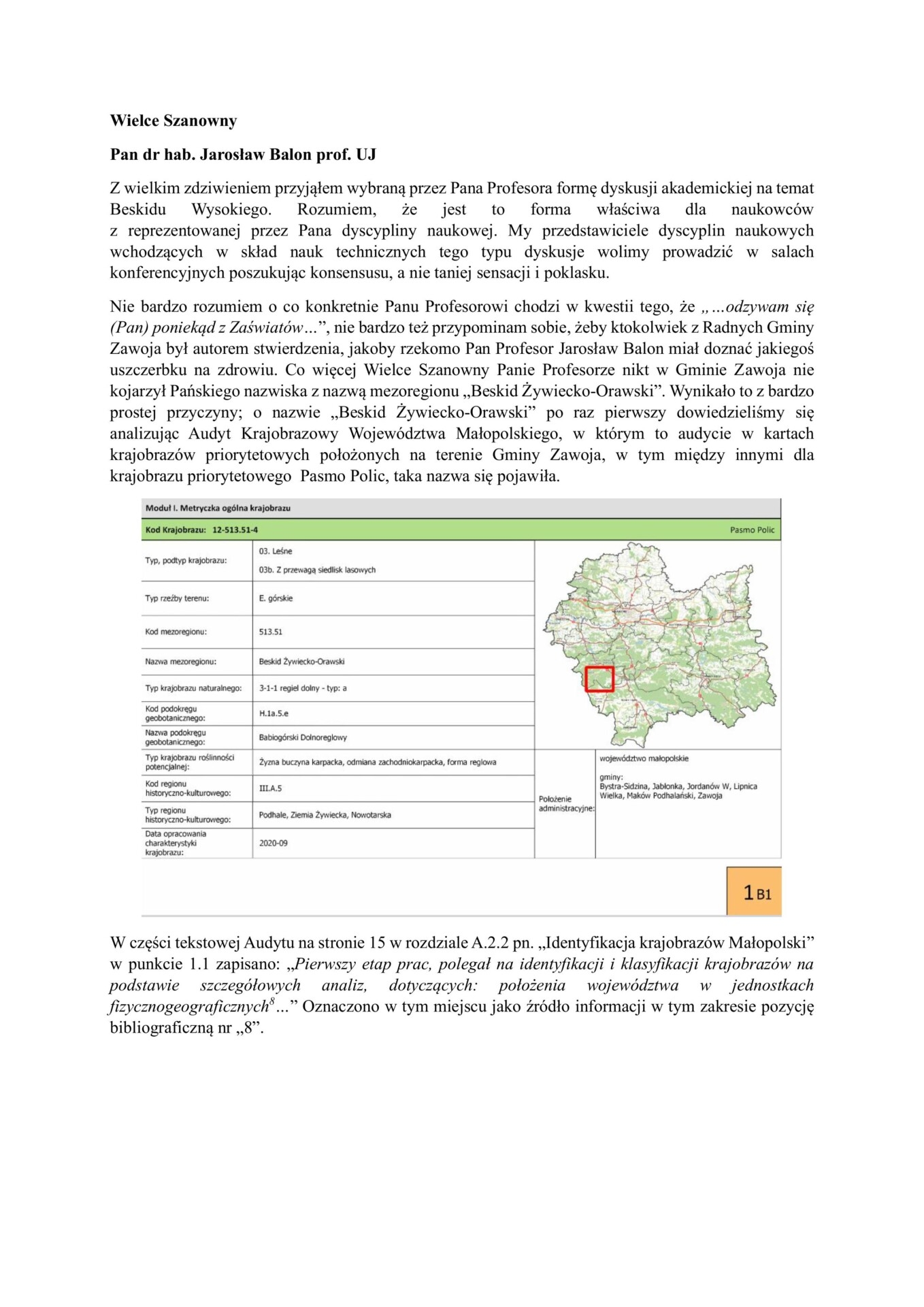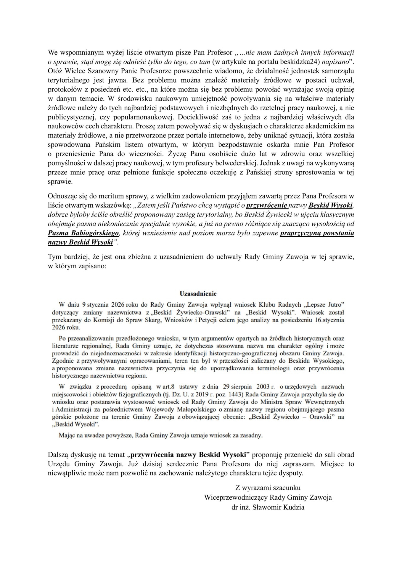 Sprawa postulatu Rady Gminy Zawoja o zmianie nazwy Beskidu Żywiecko-Orawskiego na Beskid Wysoki ma swój ciąg dalszy. Na list otwarty dra hab. Jerzego Balona, prof. UJ odpowiedział wiceprzewodniczący Rady Gminy Zawoja Sławomir Kudzia.