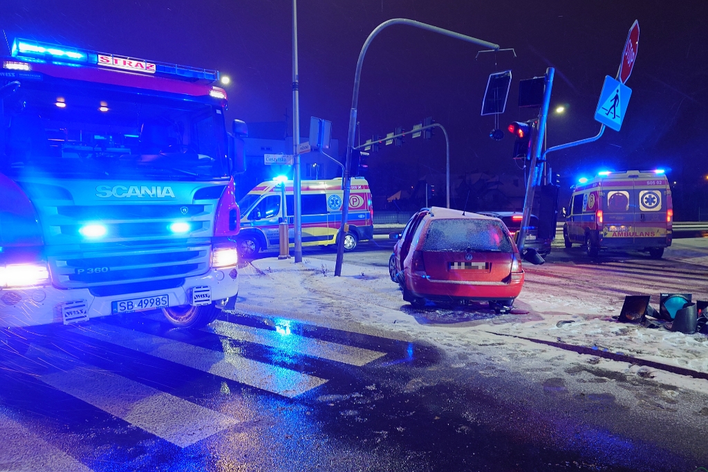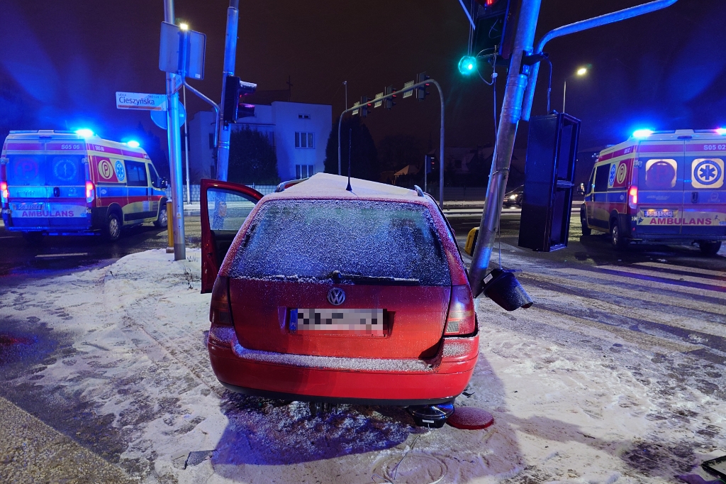 Rozbity samochód i uszkodzone dwa sygnalizatory świetlne to bilans nocnego zdarzenia drogowego na skrzyżowaniu ul. Cieszyńskiej z ul. Jesionową w Bielsku-Białej. W samochodzie podróżowały trzy młode osoby.