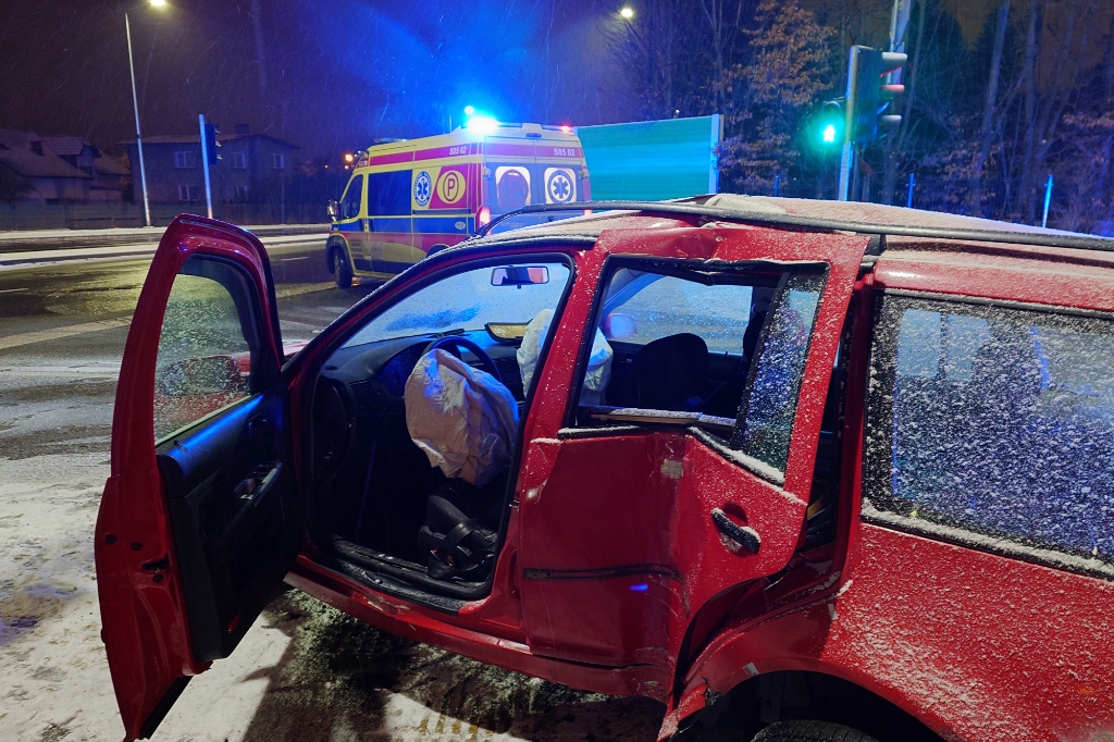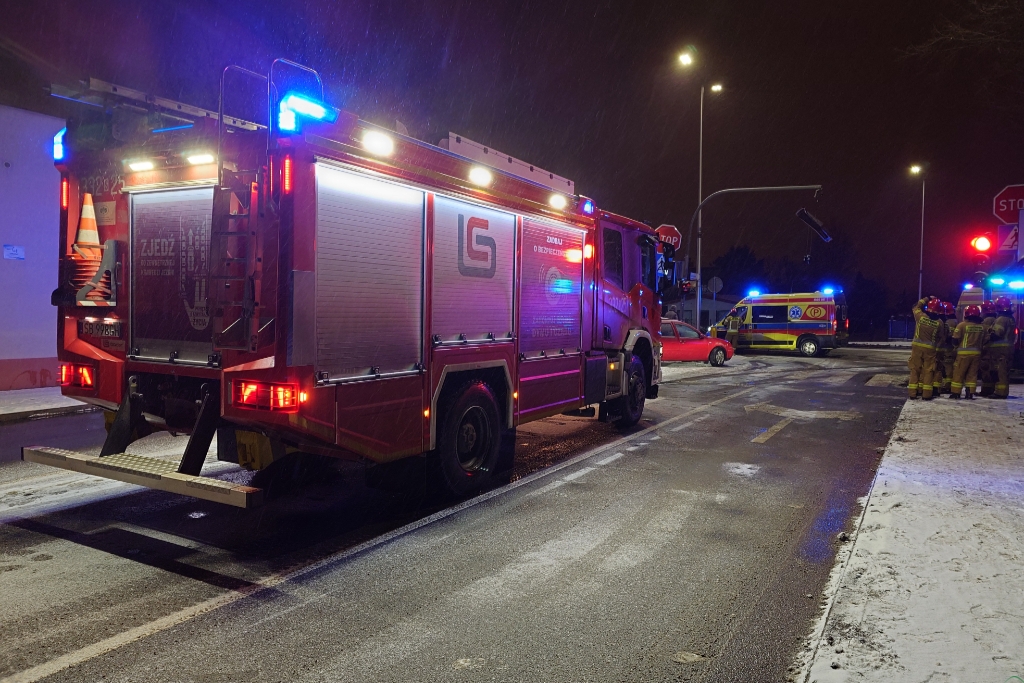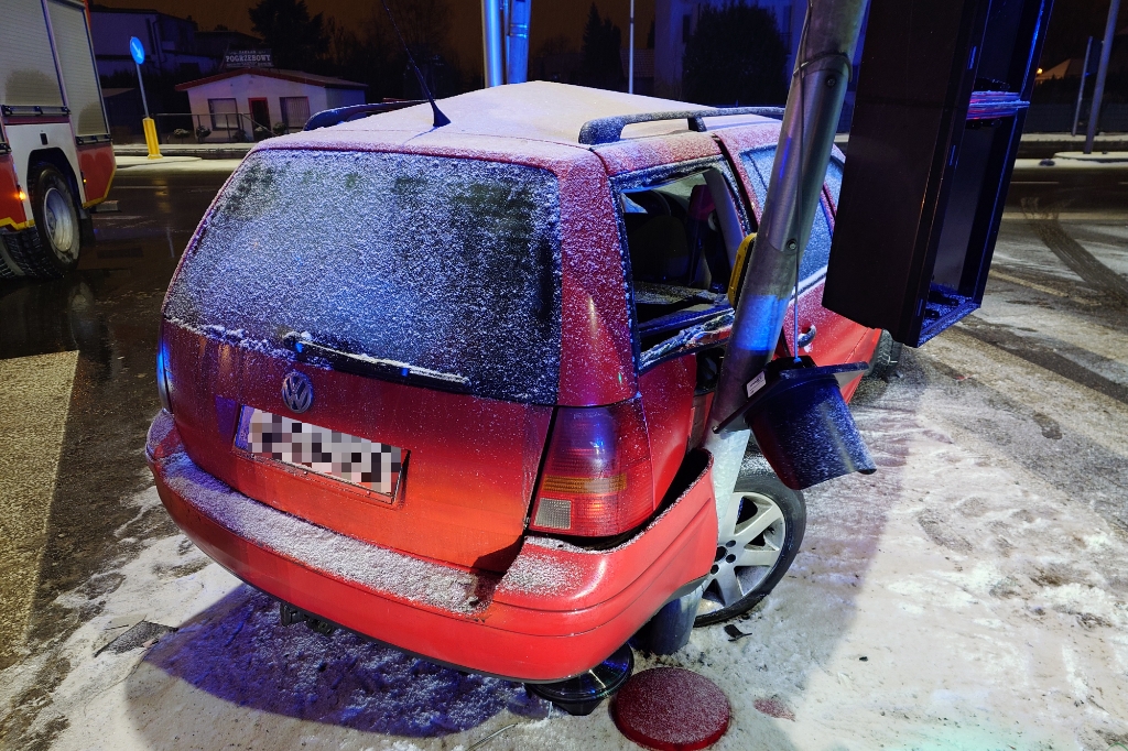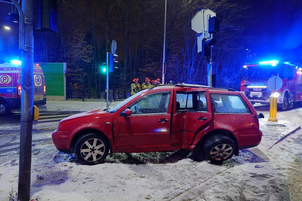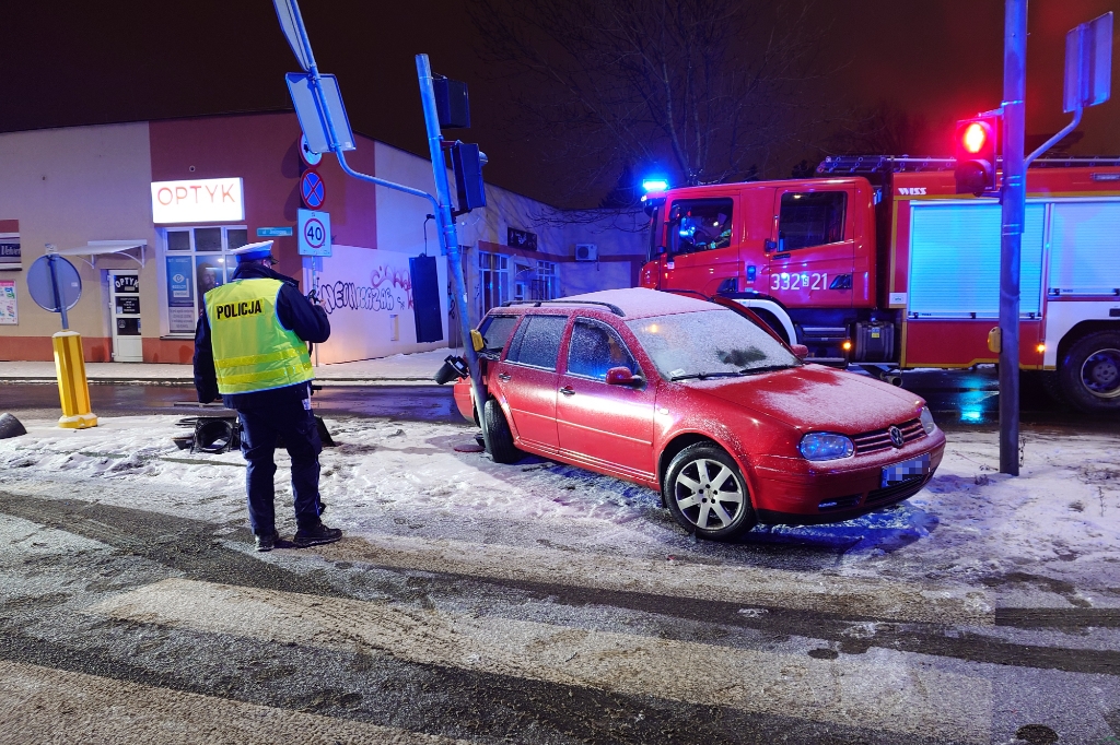 Służby zawiadomiono o godz. 3.12. Samochód uderzył w sygnalizator świetlny. Podróżowały nim trzy osoby, a jedna uskarżała się na dolegliwości kręgosłupa. Zespoły ratownictwa medycznego przebadały młodych uczestników zdarzenia – na szczęście nie było konieczności hospitalizacji.