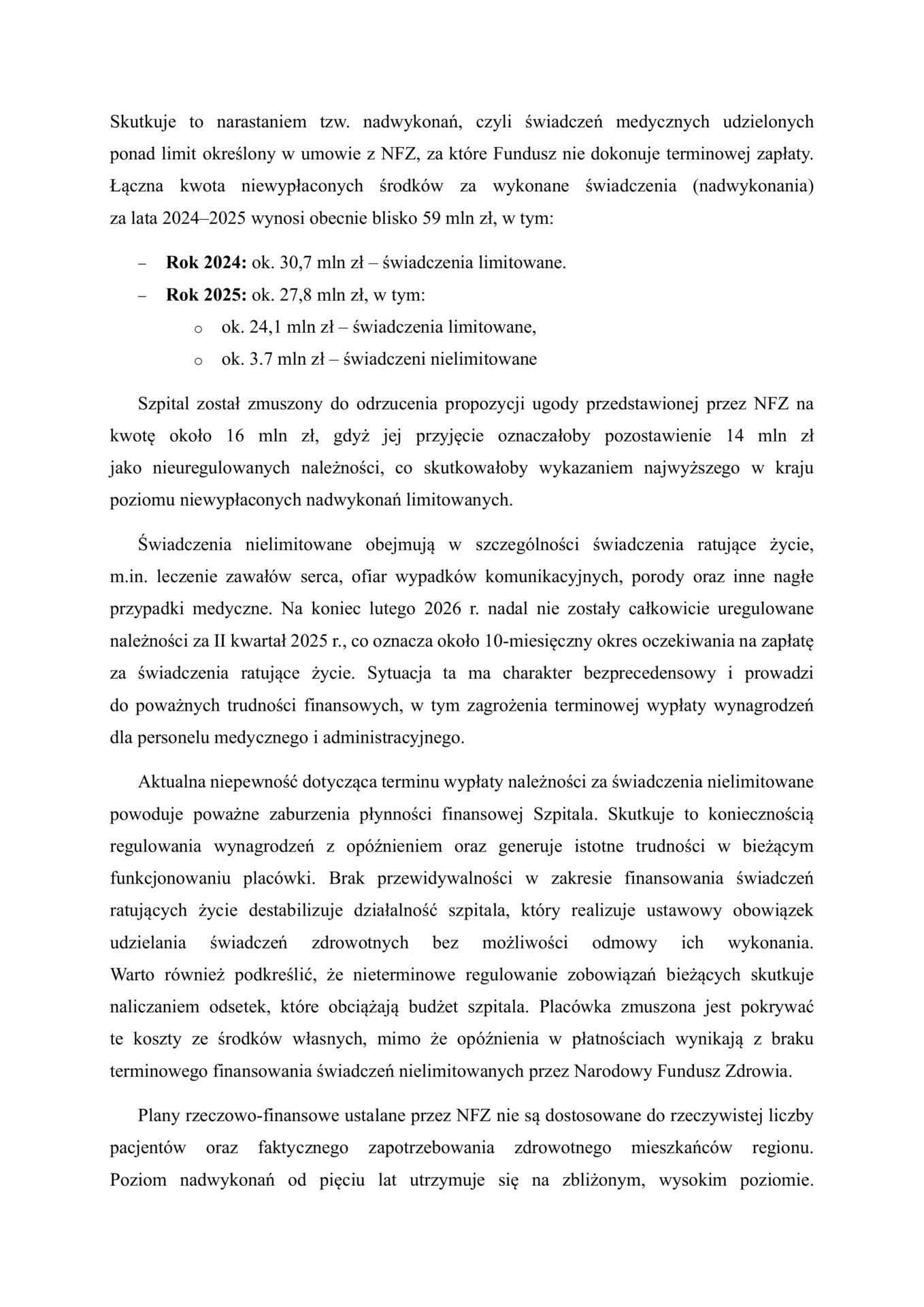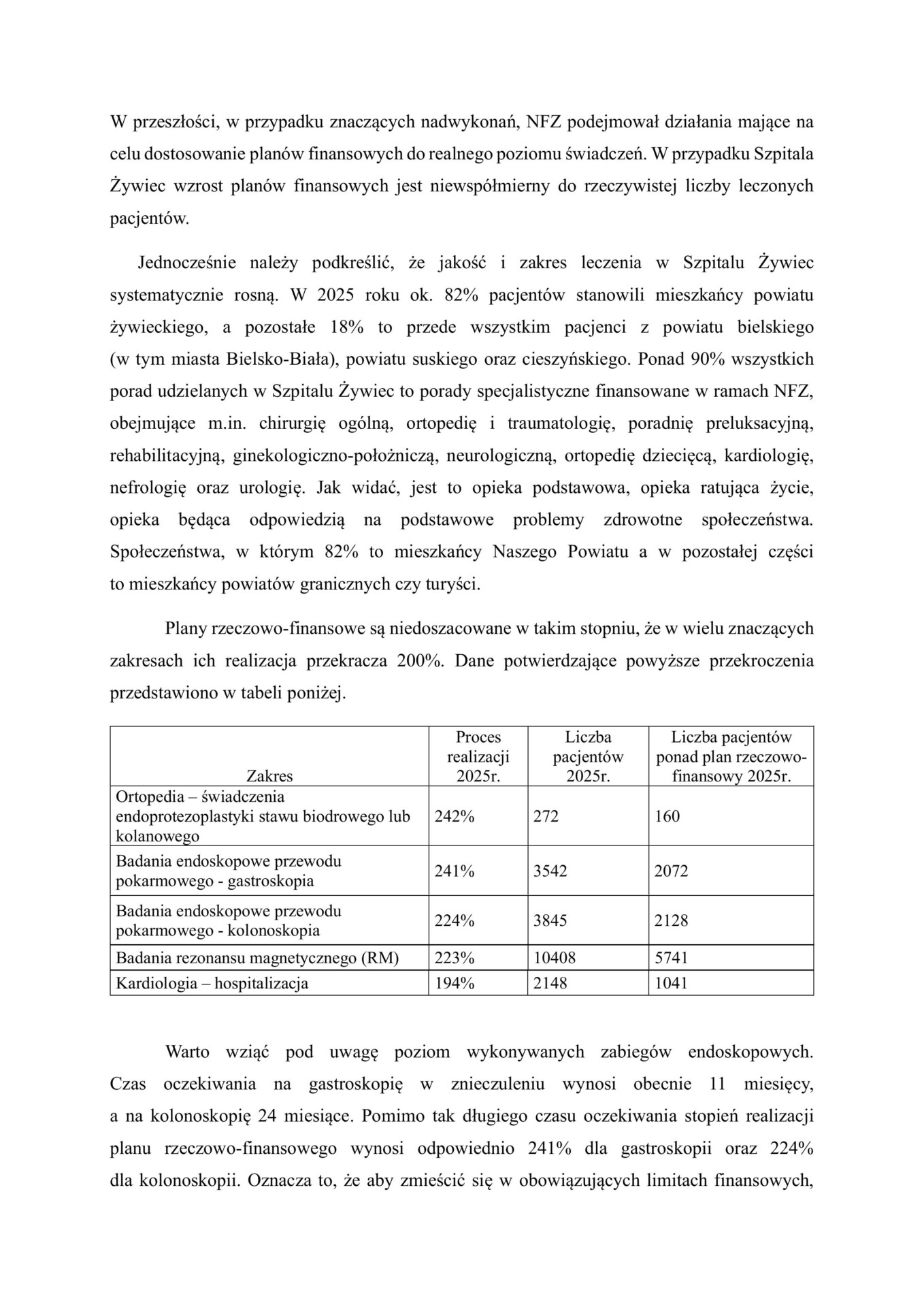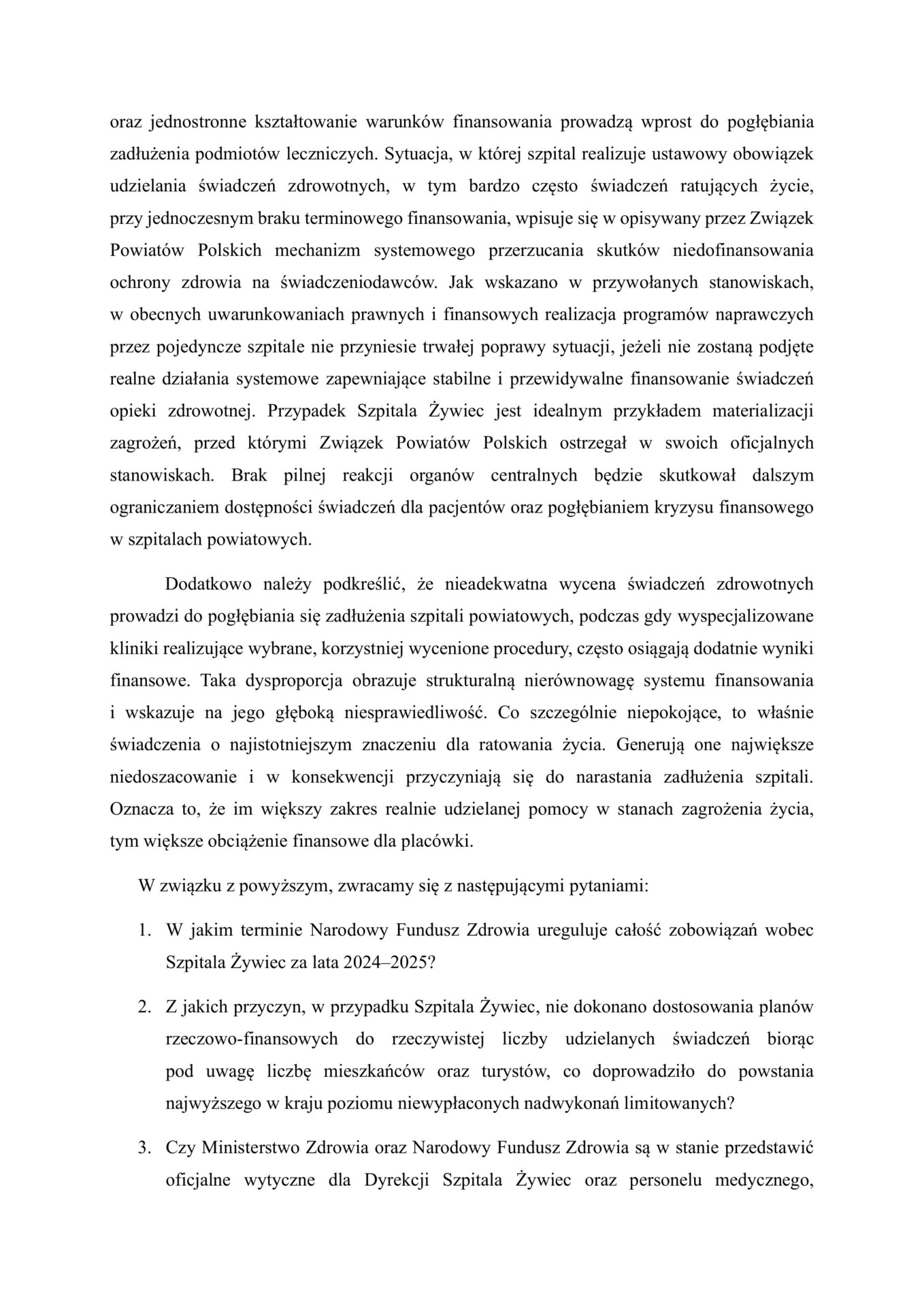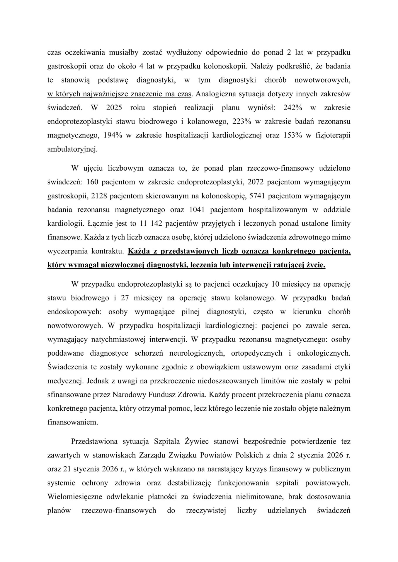 – Łączna kwota nieuregulowanych nadwykonań za lata 2024-2025 sięga blisko 59 mln zł, a opóźnienia w płatnościach za świadczenia ratujące życie sięgają nawet 10 miesięcy. Zarząd Powiatu zaapelował do minister o podjęcie natychmiastowych, systemowych działań naprawczych, które zapewnią stabilne finansowanie szpitala i zagwarantują mieszkańcom Podbeskidzia dalszy dostęp do świadczeń zdrowotnych na dotychczasowym poziomie. Zarząd wskazuje również, że brak adekwatnych środków może doprowadzić do ograniczenia działalności placówki, co nie będzie wynikiem decyzji zarządzających, lecz skutkiem systemowego niedofinansowania ochrony zdrowia – zaznacza żywieckie starostwo.