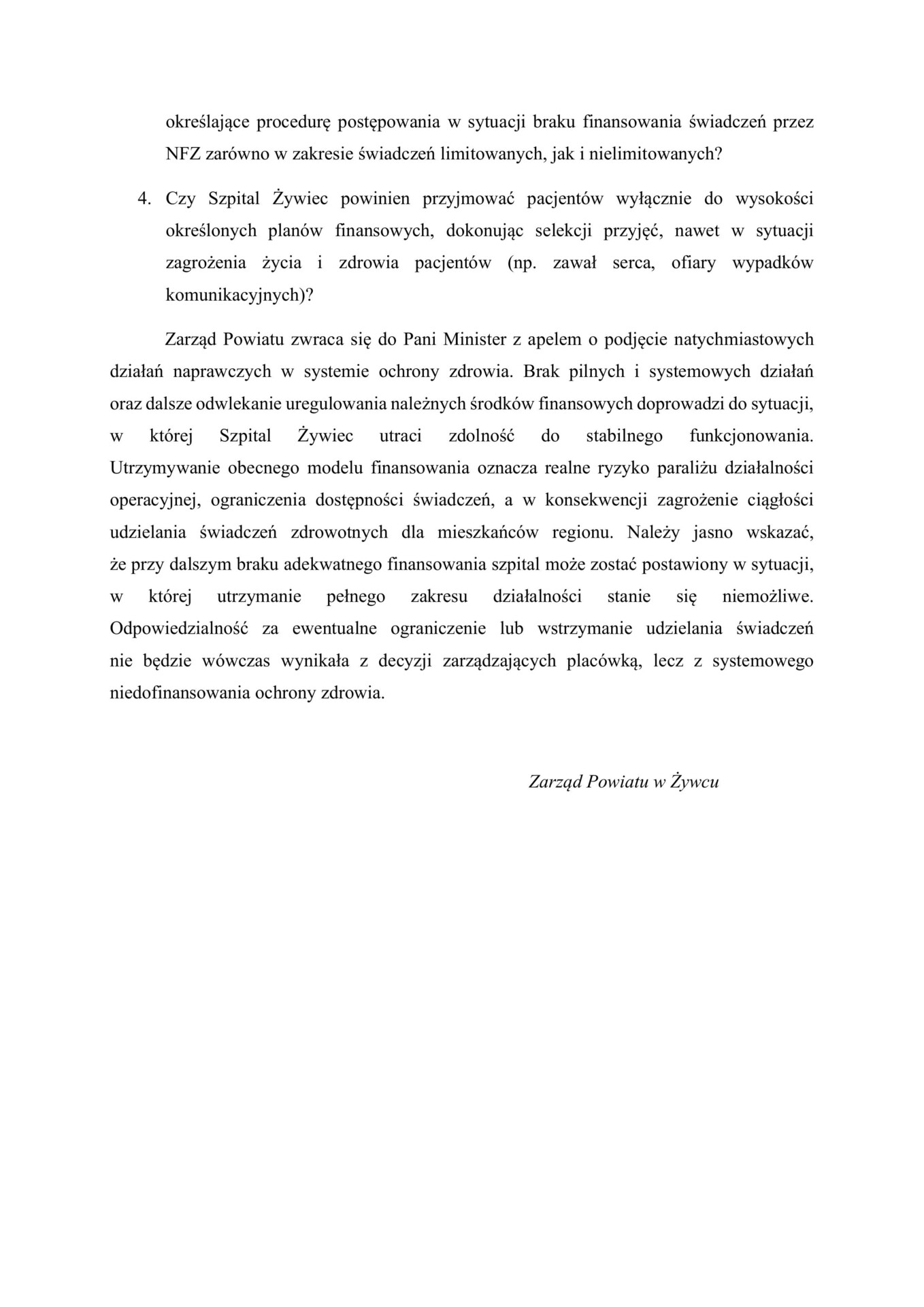 Pełna treść wystąpienia Zarządu Powiatu Żywieckiego do minister zdrowia Jolanty Sobierańskiej-Grendy