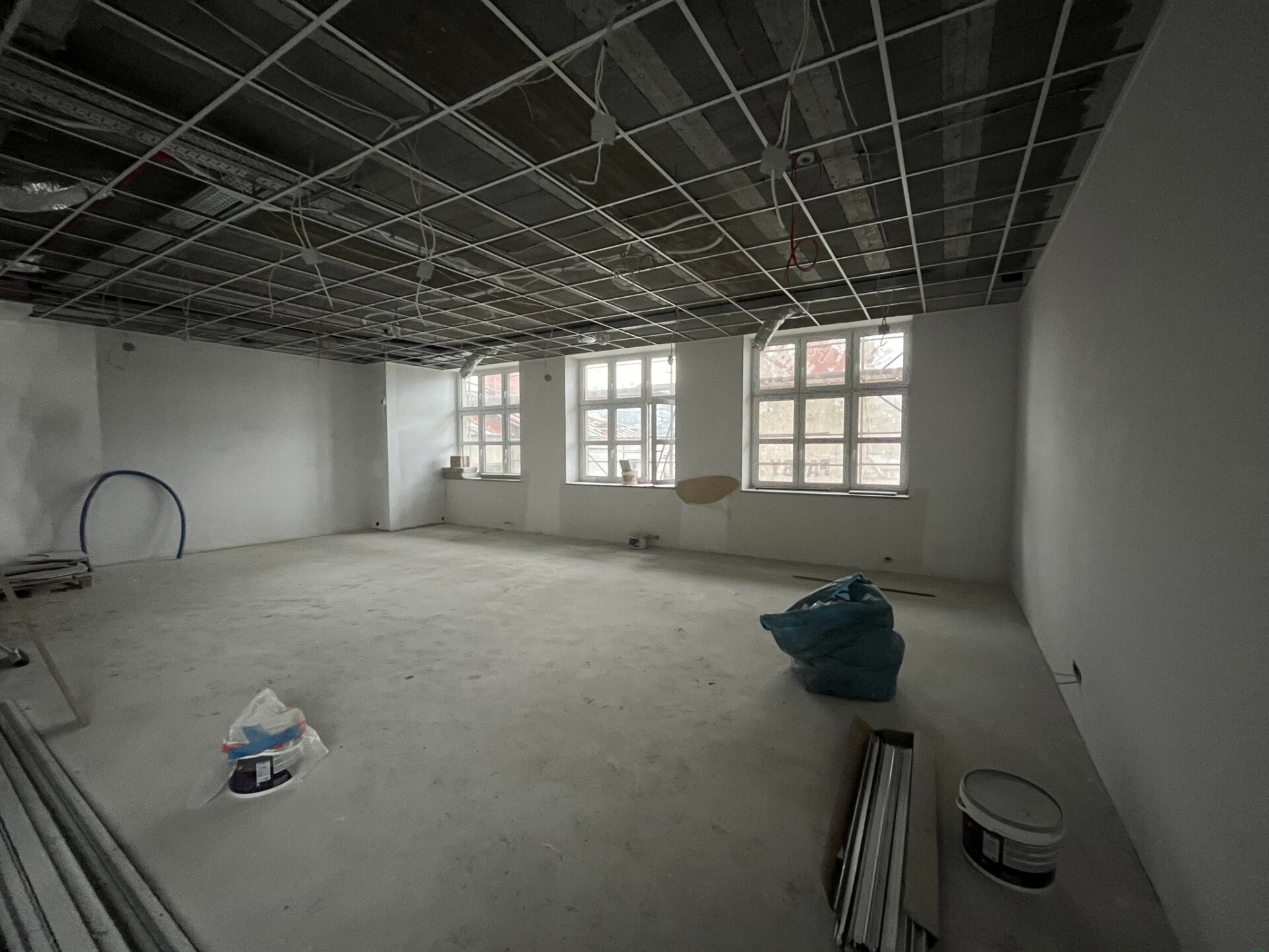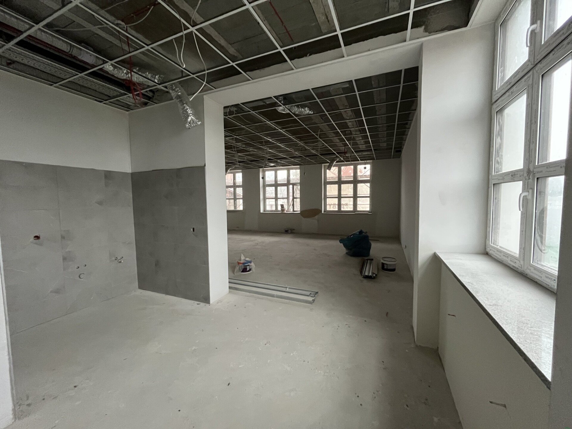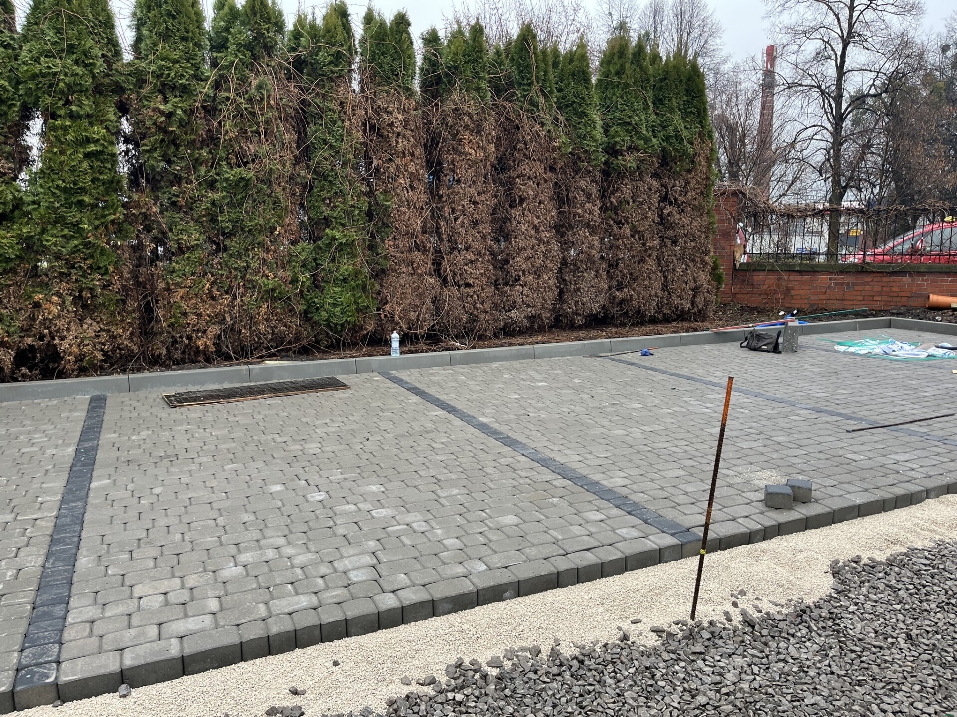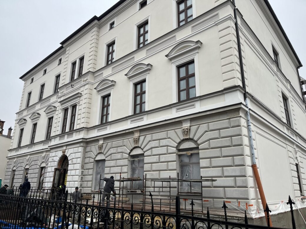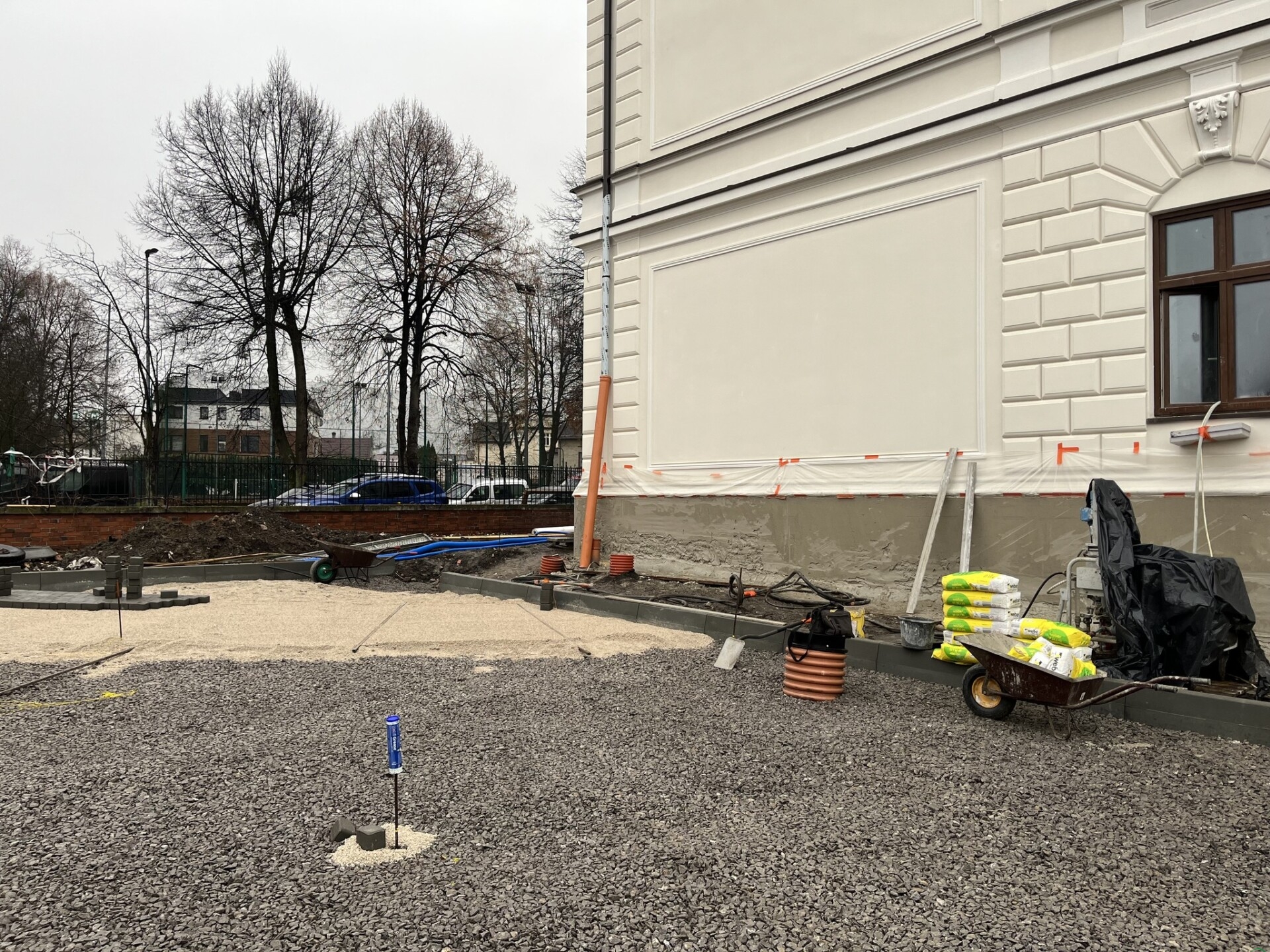 Zmiany widać z tygodnia na tydzień, zarówno w środku, jak i na zewnątrz. Prace idą pełną parą. Wokół budynku powstają miejsca parkingowe – przygotowywana jest podbudowa, montowane są krawężniki i porządkowany teren. Równolegle trwają prace przy elewacji północnej, gdzie pojawiają się nowe tynki. W środku natomiast montowane są kamienne parapety, wykonywana jest izolacja przeciwwilgociowa w piwnicach, a na parterze i pierwszym piętrze układane są nowe posadzki. Ekipy pracują także przy instalacjach elektrycznych i sanitarnych.